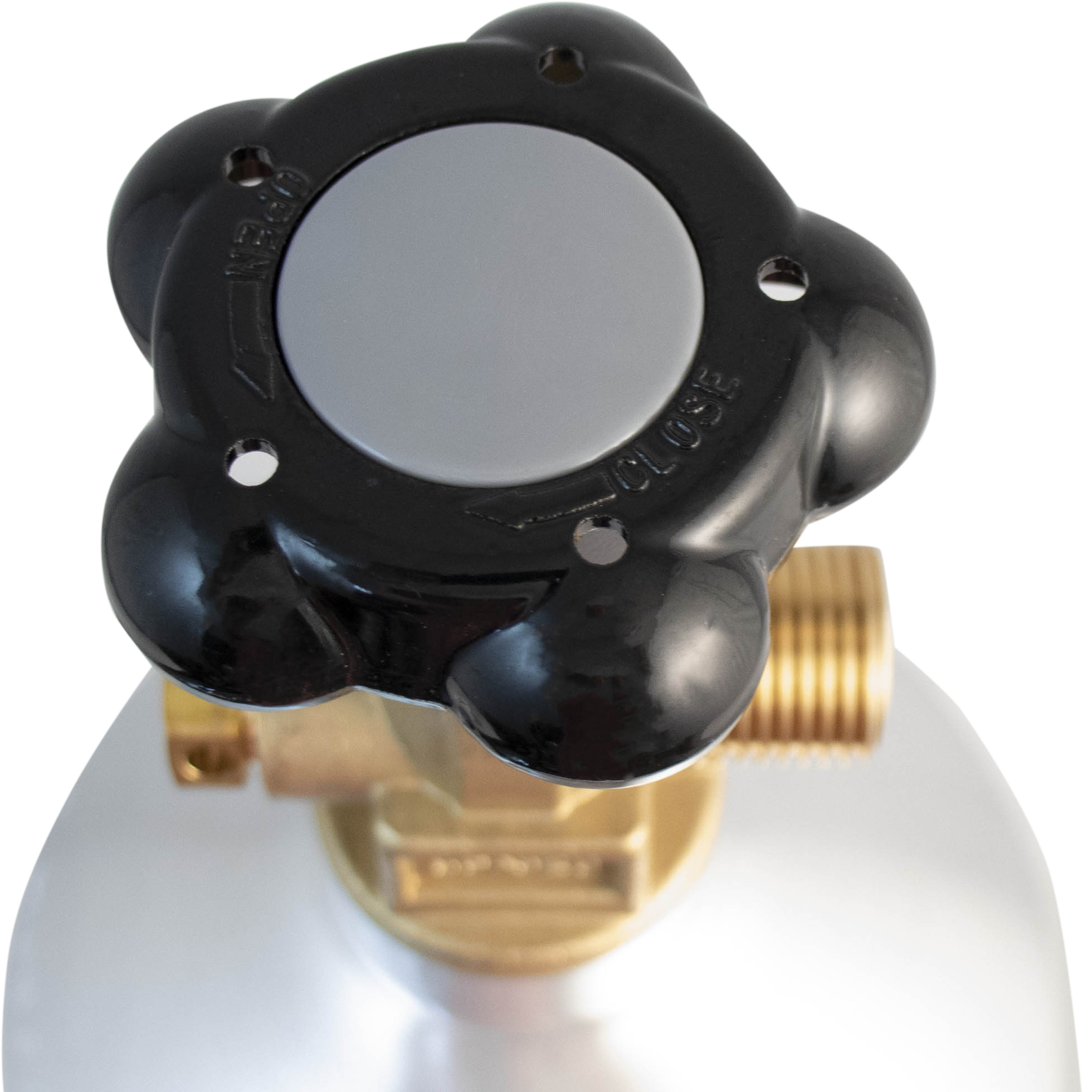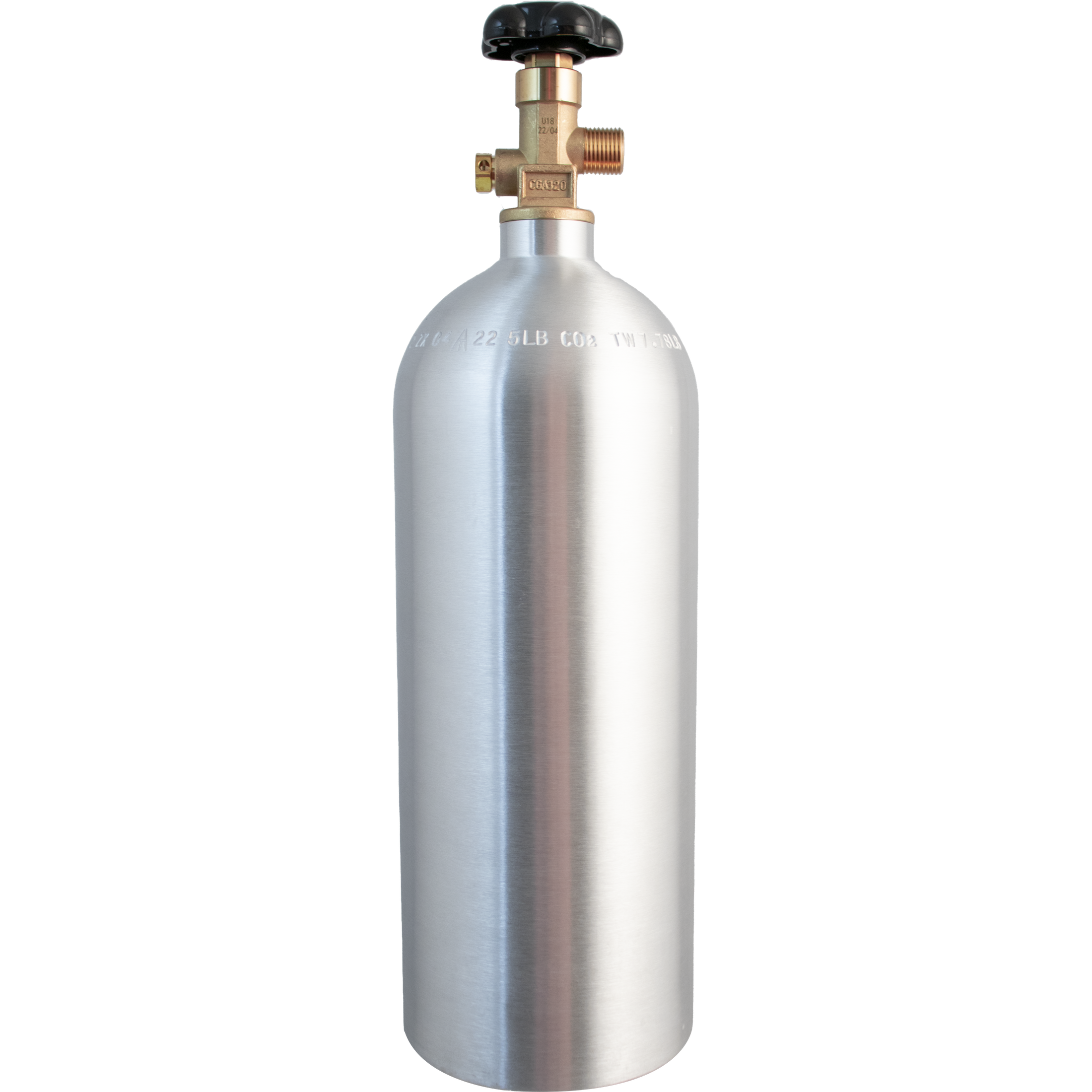 Because it is made of aluminum rather than steel you can feel confident that it won’t rust. It’s called a 5 lb tank because it holds 5 lbs of compressed (liquified) CO2. 5 lbs of CO2 is enough to dispense about 8 to 9x 5-gallon kegs of homebrew.