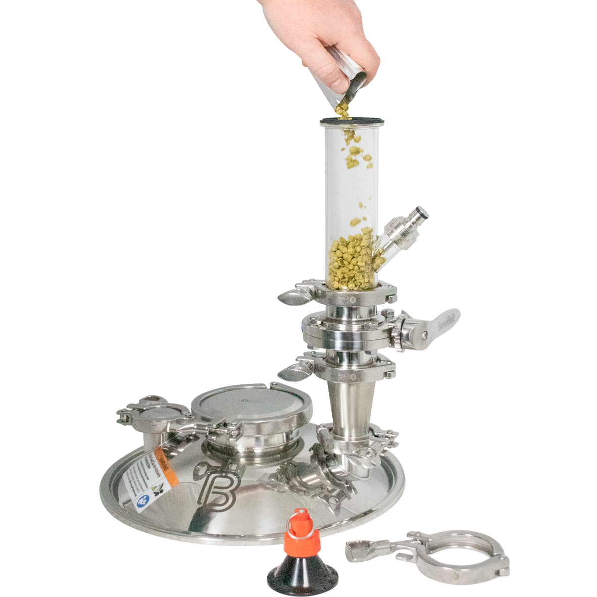This kit is specifically adapted for use with the BrewBuilt X-Series conical fermenters and can be used with any stainless fermenter with 1.5" tri-clamp top port. The 2" T.C. Hop Bong attaches to a stainless 2" butterfly valve that then connects to a 2" x 1.5" T.C. reducer. This allows the largest capacity Hop Bong to be used with any of the 1.5" T.C. accessory ports on the BrewBuilt Conical's lid.