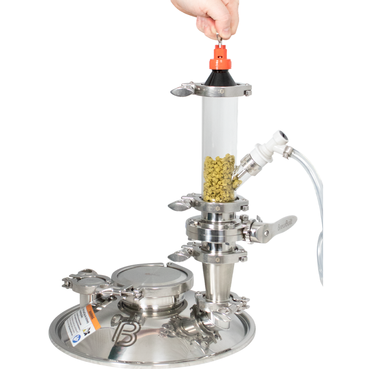 The Hop Bong is a versatile pressurizable tri-clamp accessory that is perfect for purging oxygen from your dry hops before dropping them into your fermenter. Load up the Hop Bong, flush it with CO2, purge out oxygen with the handy PRV on top, then simply open the Butterfly Valve to inject your beer with a 6 oz payload of dry hops.