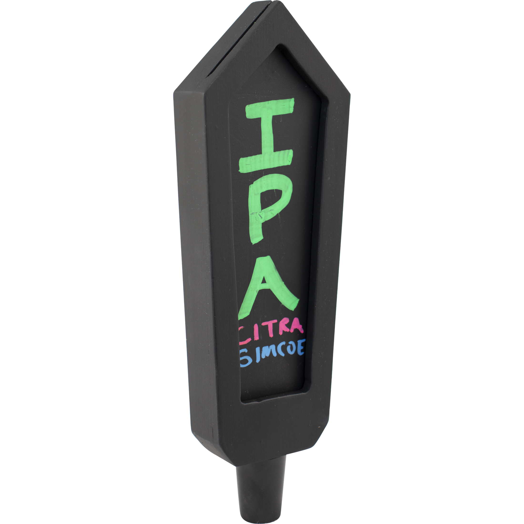 These tap handles come with a removable, erasable chalkboard surface. Additionally, the back of the tap handle features a chalkboard surface that can be written on as well, which is handy and cool if your tap handle is seen from both sides. The insert is made of a thin sheet of metal and coated with chalkboard paint. The outer portion of the tap handle is made of wood and also painted with chalkboard paint.