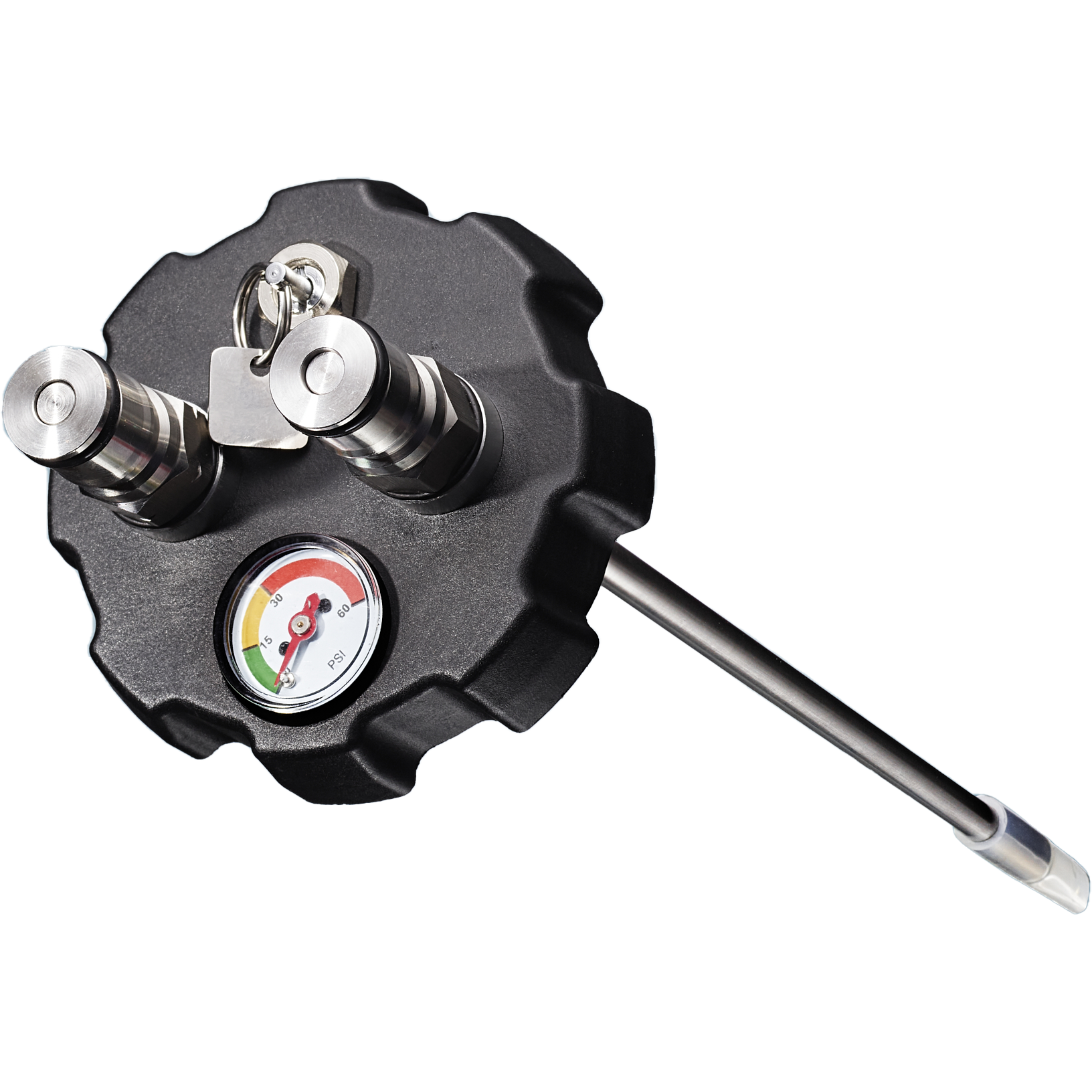 Each cap includes ball lock posts for CO2 in and a “beverage out”, an integrated safety valve, a zipper tab to relieve any excess pressure, and PSI gauge! There’s even a dip tube (just like a real keg) to ensure you get every last drop from your growler!