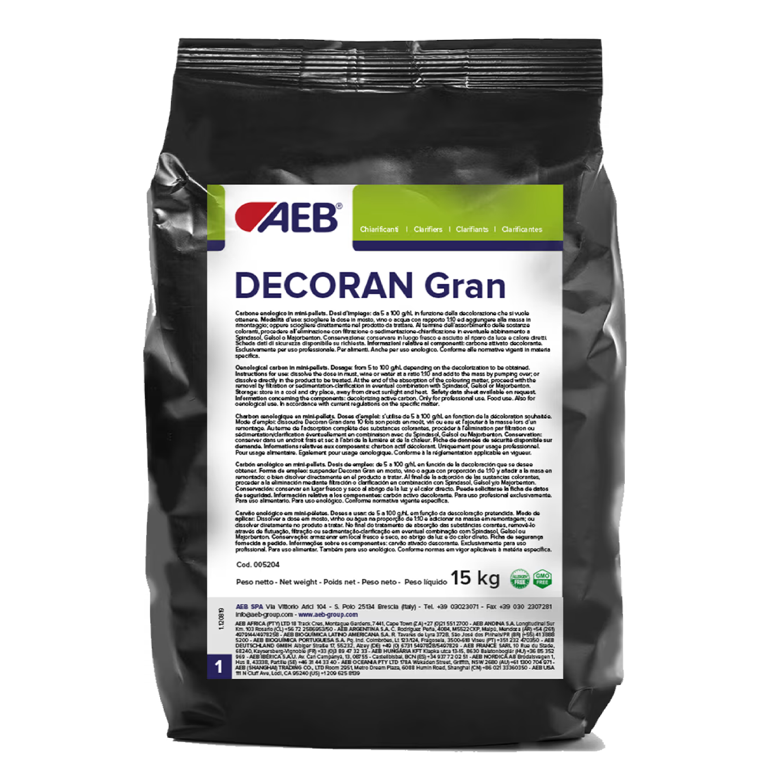 Decoran Gran is an activated carbon in micro-pellet form, produced through controlled carbonization and activation. It excels at reducing excessive color, high-molecular polyphenols, and oxidized compounds in both must and wine. Unlike standard powdered carbon, its pelletized form significantly reduces dust, minimizes operator exposure, and enhances dosing accuracy. With an internal surface area exceeding 1000 m² per gram and pore sizes optimized for adsorption, Decoran Gran delivers fast, reliable color correction while preserving desirable sensory attributes.