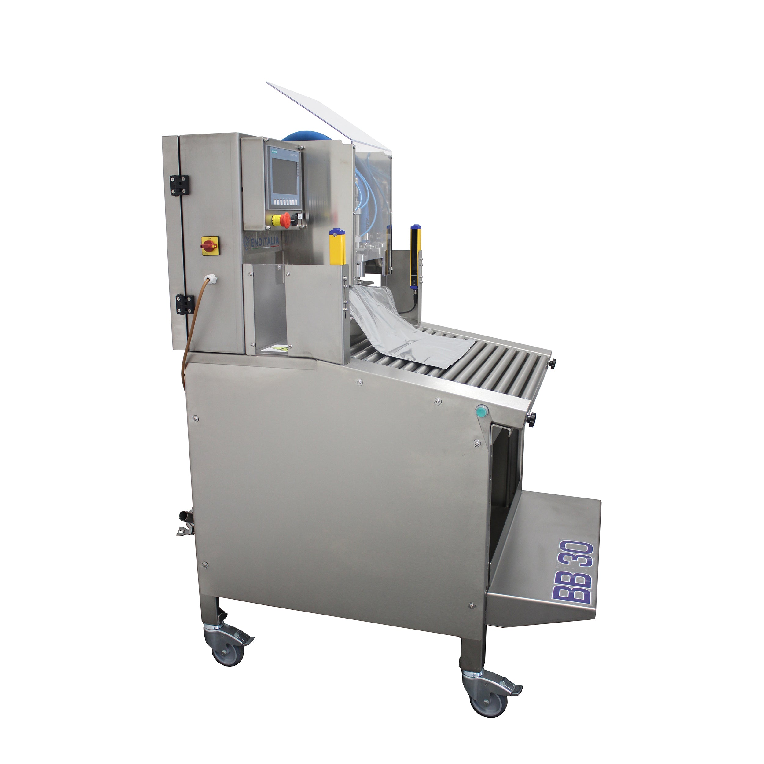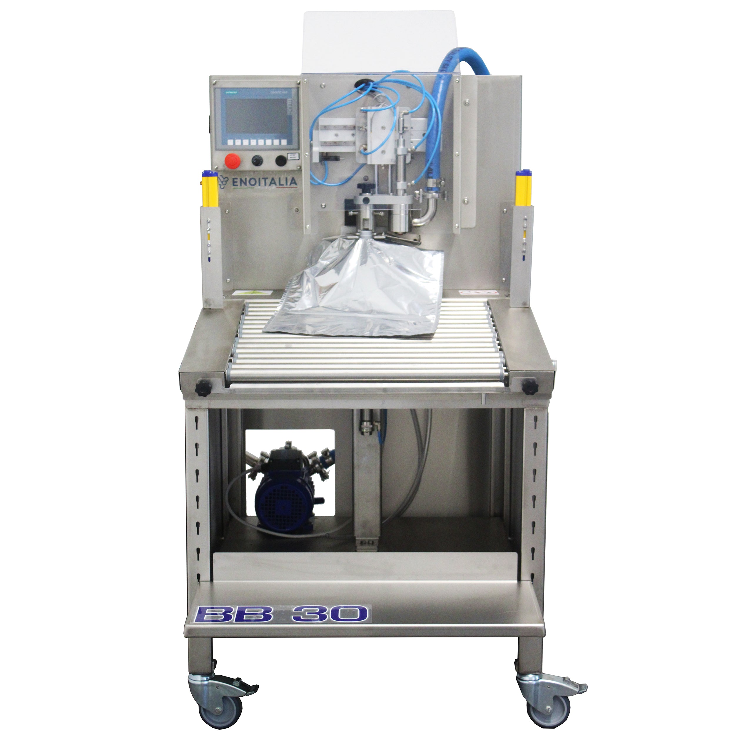 The BB30 a semi-automatic bag-in-box filler manufactured by Enoitalia in Italy. The beauty of this machine is the simplicity. The BB30 automatically carries out the cycle of vacuuming the bag, filling, and then finally nitrogen flushing. The operator inserts the bag and activates the machine to remove the valve, fill the bag, and reinstall the valve in one smooth, seamless operation. The possibility to choose between different types of flow sensors allows the BB30 to be used with liquids of different viscosities, including wine, fruit juices, olive oil and more. Filling can be carried out at room temperature or hot up to 212°F / 100°C. In the case of hot filling, specific accessories are available depending on your set up. A self-priming volumetric pump with rubber impeller is installed as standard. This pump offers a high flow rate, the possibility to prime/draw from any container, an anti-pressure by-pass valve and a total drain valve for emptying the filling circuit.