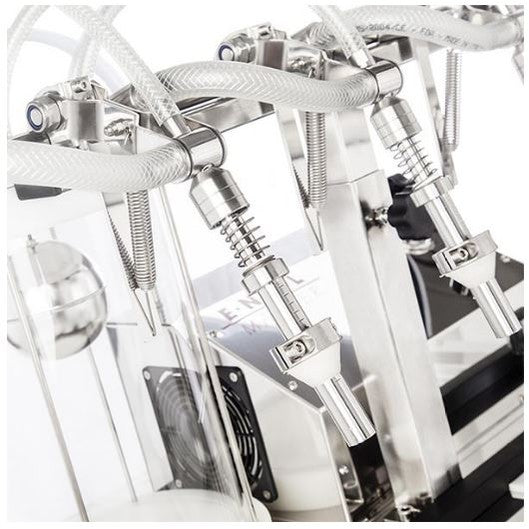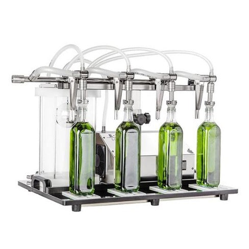 A commercial version of the Enolmatic filler that features four filling heads and allows you to fill up to 600 bottles per hour. This is the best bottle filler for the large-scale home winemaker or a small commercial operation. Through the use of a vacuum, the Enolmaster filler automatically starts a siphon, sucks the air out of your wine bottles to preserve freshness, and automatically shuts off when each bottle is filled to the perfect height every time. Not only does the entire process take place in a nearly oxygen-free environment, preserving the freshness of your wine, the rate of fill is extremely fast allowing you to bottle up to 600 bottles per hour.