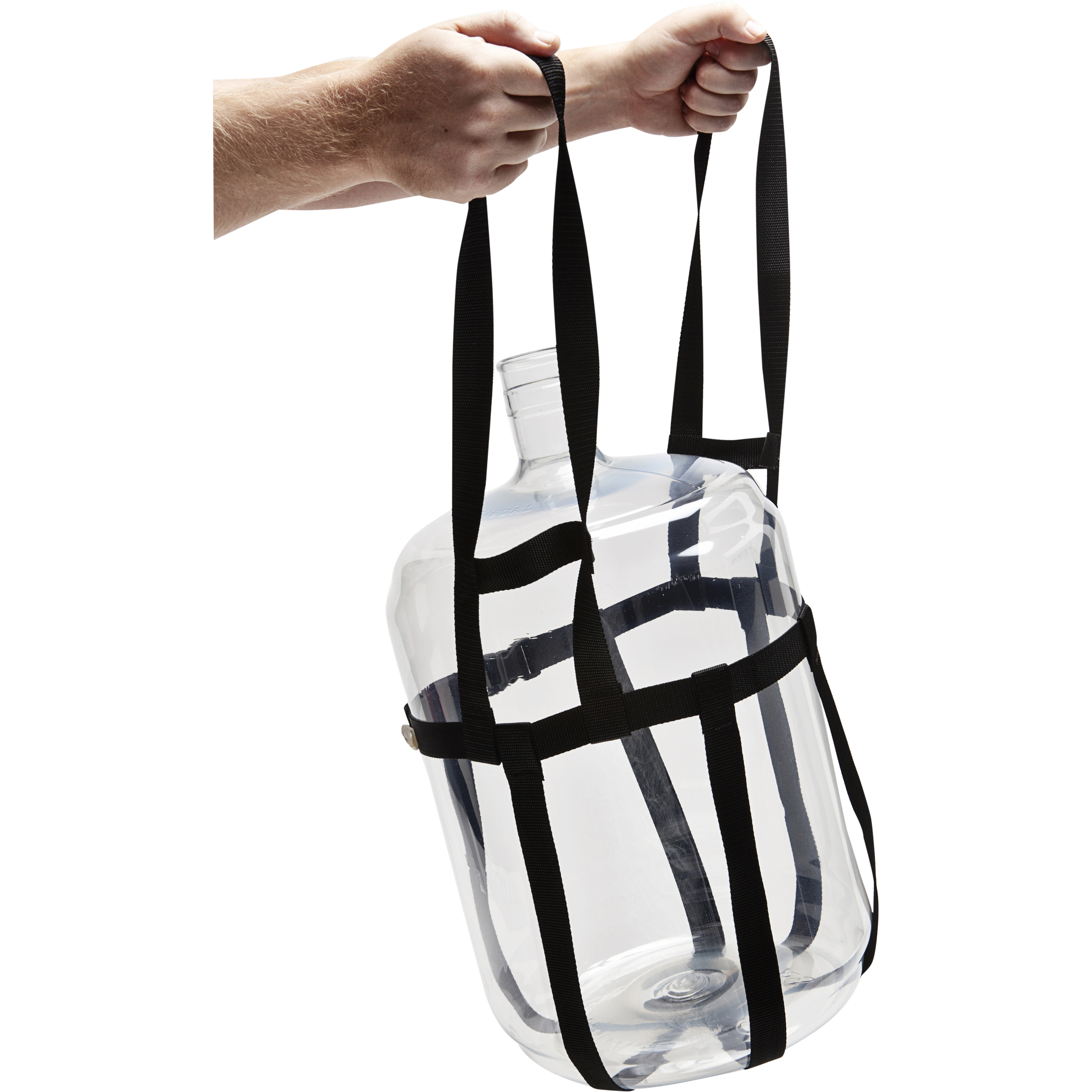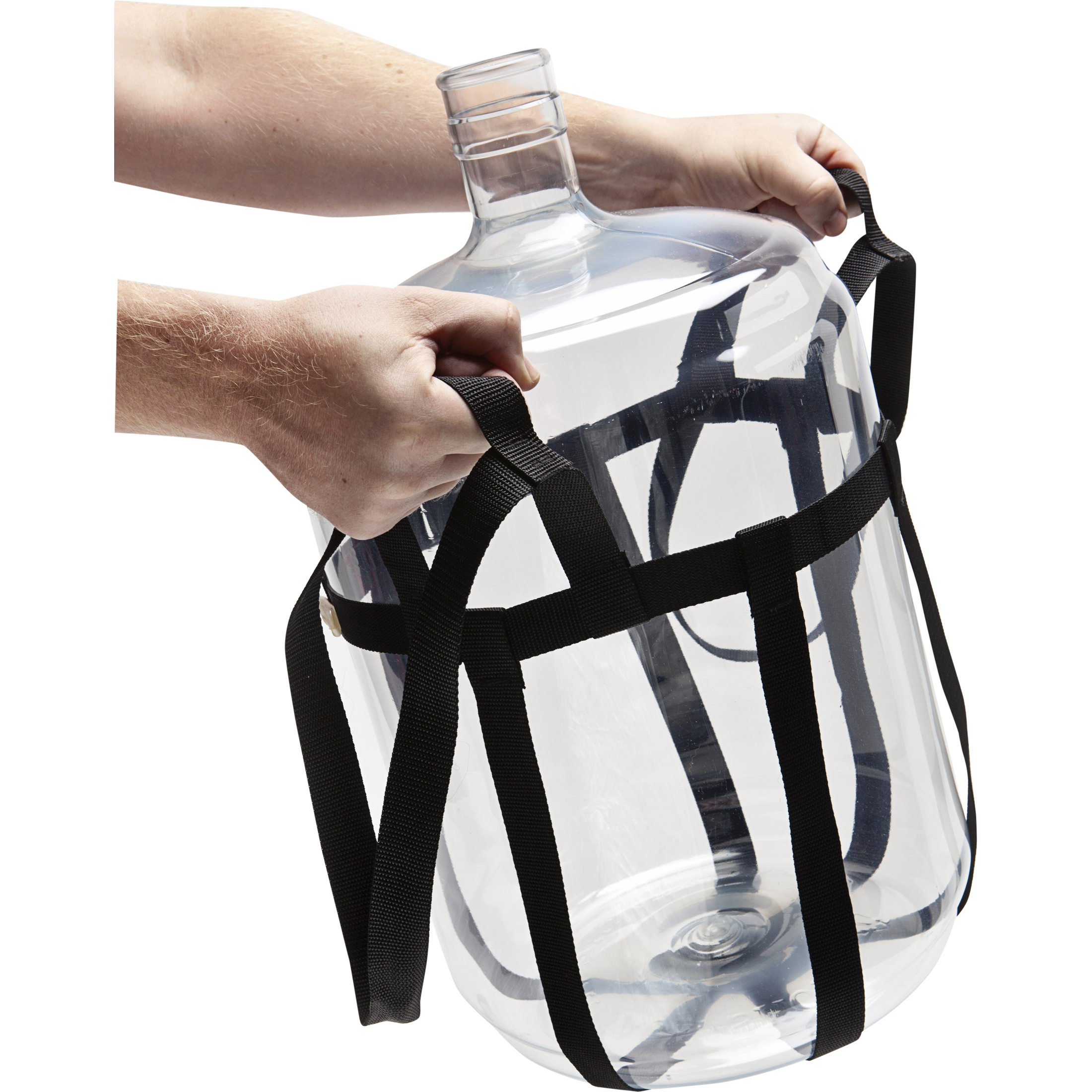 Use the Carboy Carrier to move your Fermonster or Plastic Carboy around with ease. The harness and strap handles are made from heavy-duty polypropylene, enabling you to haul up to 100 lbs of your wine without the risk of loosing your grip. Cradle your carboy with confidence and avoid spilling! The carrier comes with handles in two different positions for added convenience. Short handles for lifting and long handles for moving. The long handles are especially handy when lifting your carboy out of a top-loading fermentation locker.