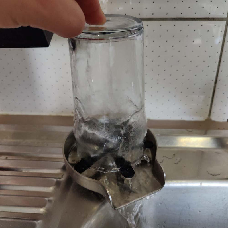 If you have access to an inline carbonated water source, using bubbly water will really give your glasses a stripping clean. This device can also be used with chilled water to cool your glass down in between beverages.