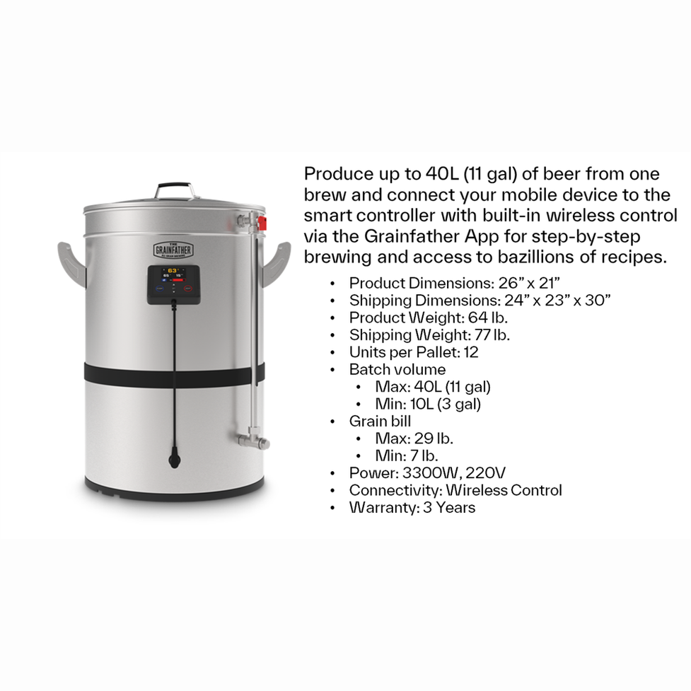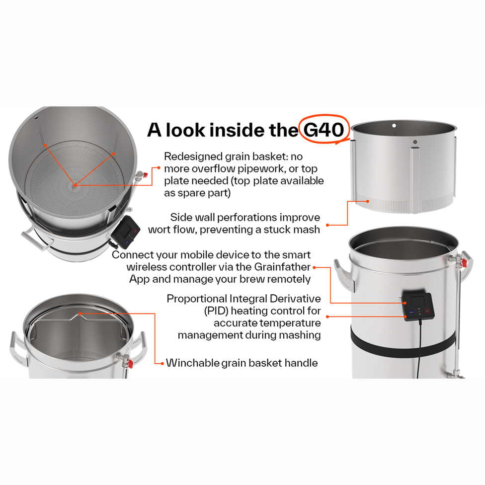 The Grainfather G40 brewing system has a bigger capacity and better connectivity. Produce up to 40L (11 US Gal) of beer from one brew and connect your mobile device to the smart controller with built-in wireless control via the Grainfather App, for step-by-step brewing and access to bazillions of recipes.