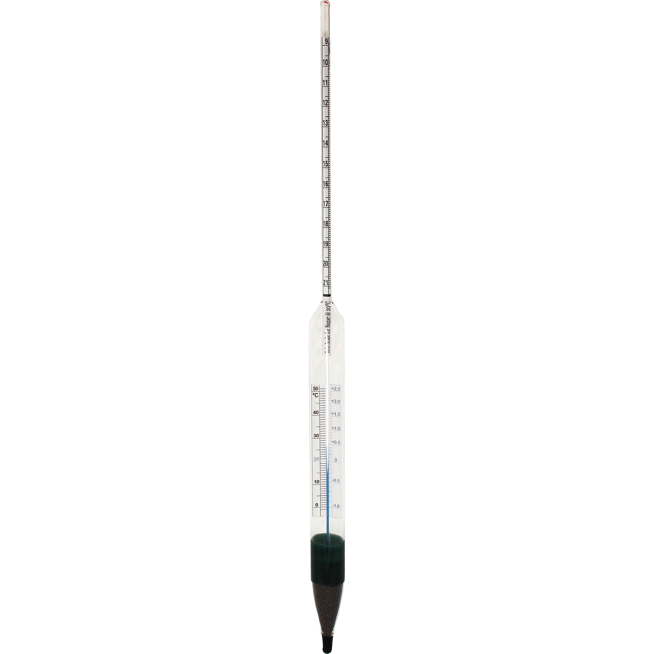 Precise hydrometer for measuring the sugar content and progress of fermentation in wine ferments. Comes with a thermometer/correction scale built-in. 15" total length.
