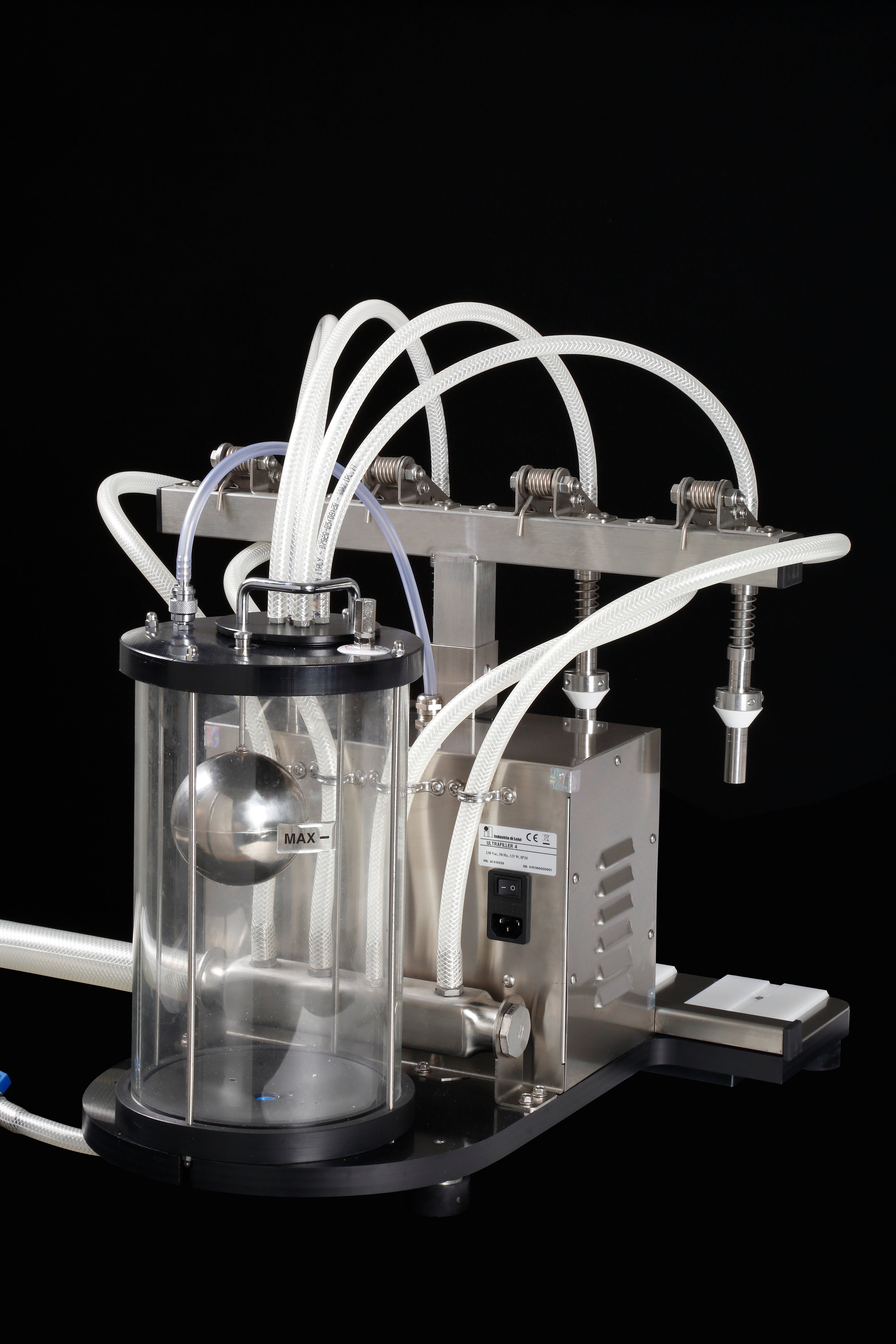 The Ultrafiller 4 is built entirely in stainless steel with PYREX tank, featuring four high efficiency and precision stainless steel filling nozzles. This professional bottling machine is perfect for wine, uncarbonated beer or cider, spirits, and oils. When you place the bottle under the Ultrafiller 4, the fluid is sucked into the vacuum created inside it, without any contact between the liquid and the pumps or mechanical components.