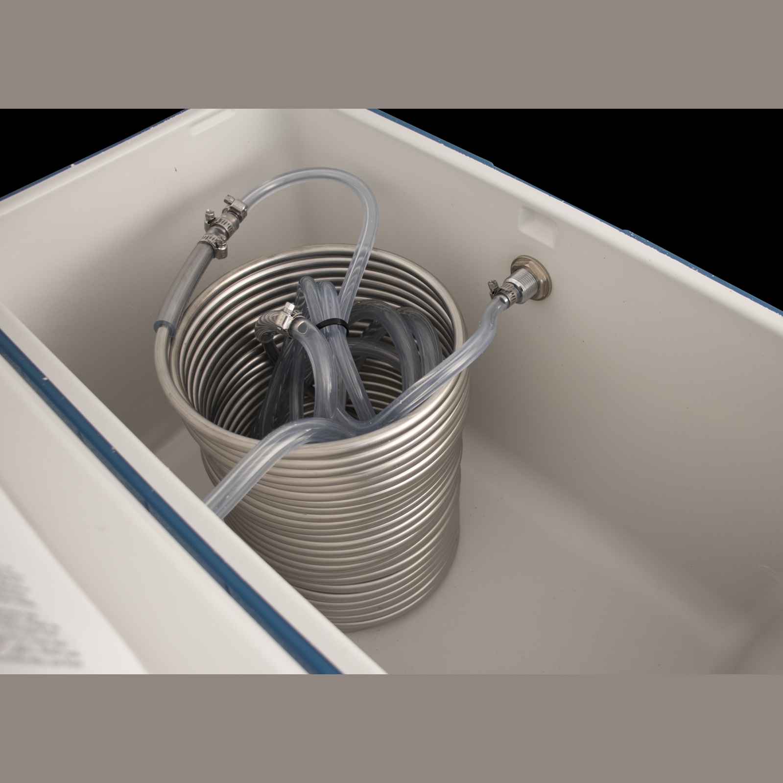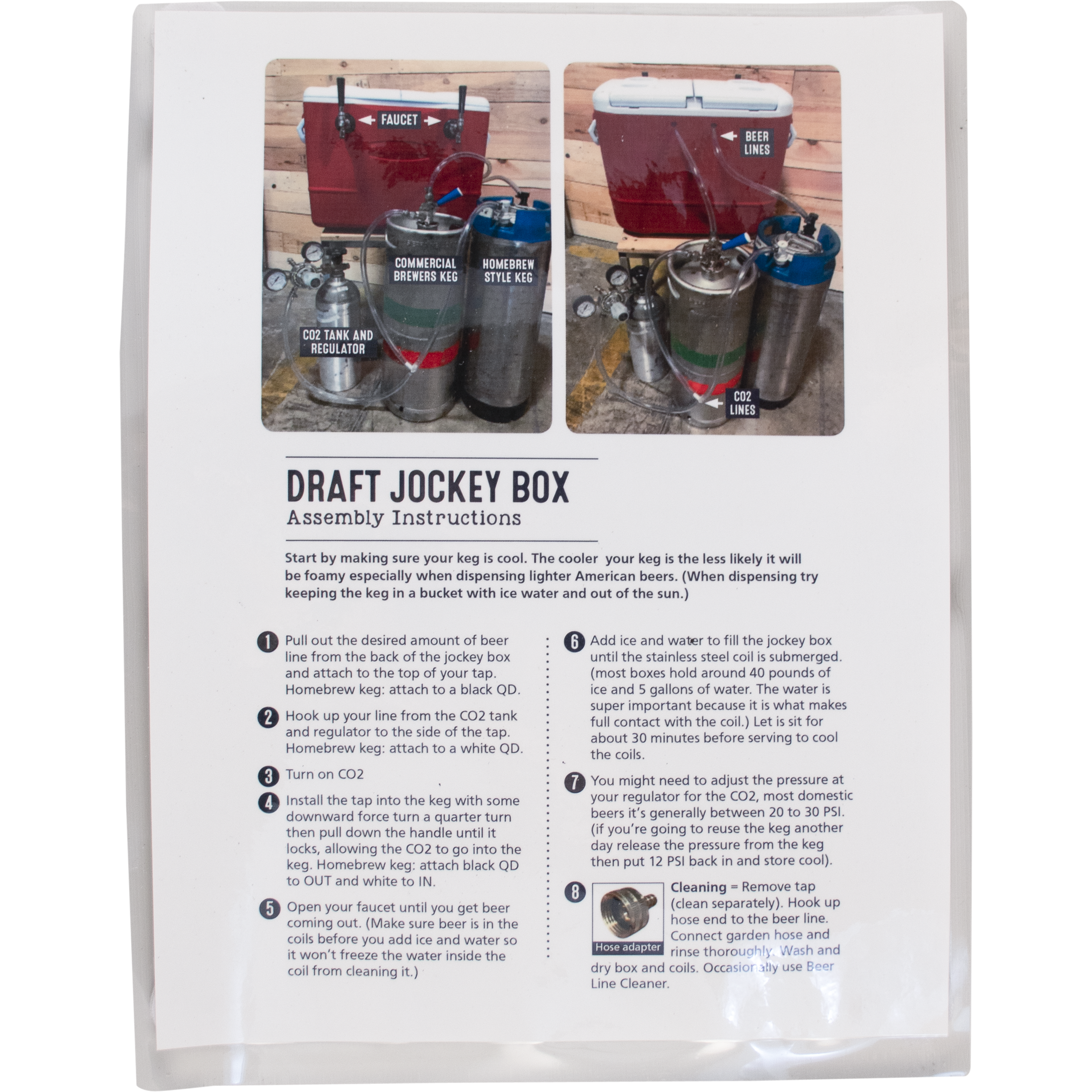 Single tap draft box with 50' 3/8" coil. This box only requires 10-12 psi to push beer, perfect for people who will leave beer tapped up for the weekend (like homebrewers). The lower pressure means you do not have to run 30-40 PSI which will quickly overcarbonate beer if left hooked up for too long. High-quality beverage tubing included. Lines retract back into the box for easy mobility. Use ice water around coil.