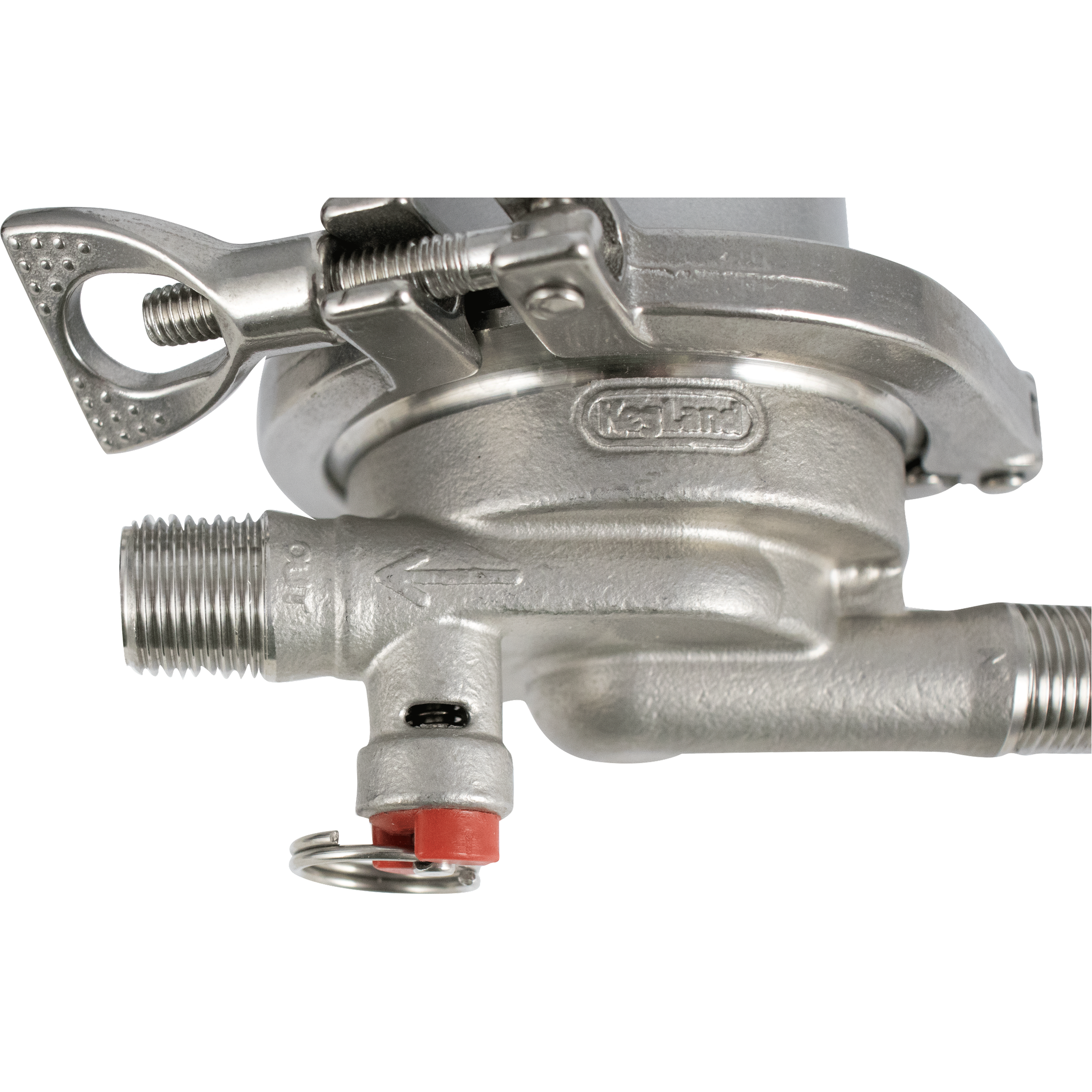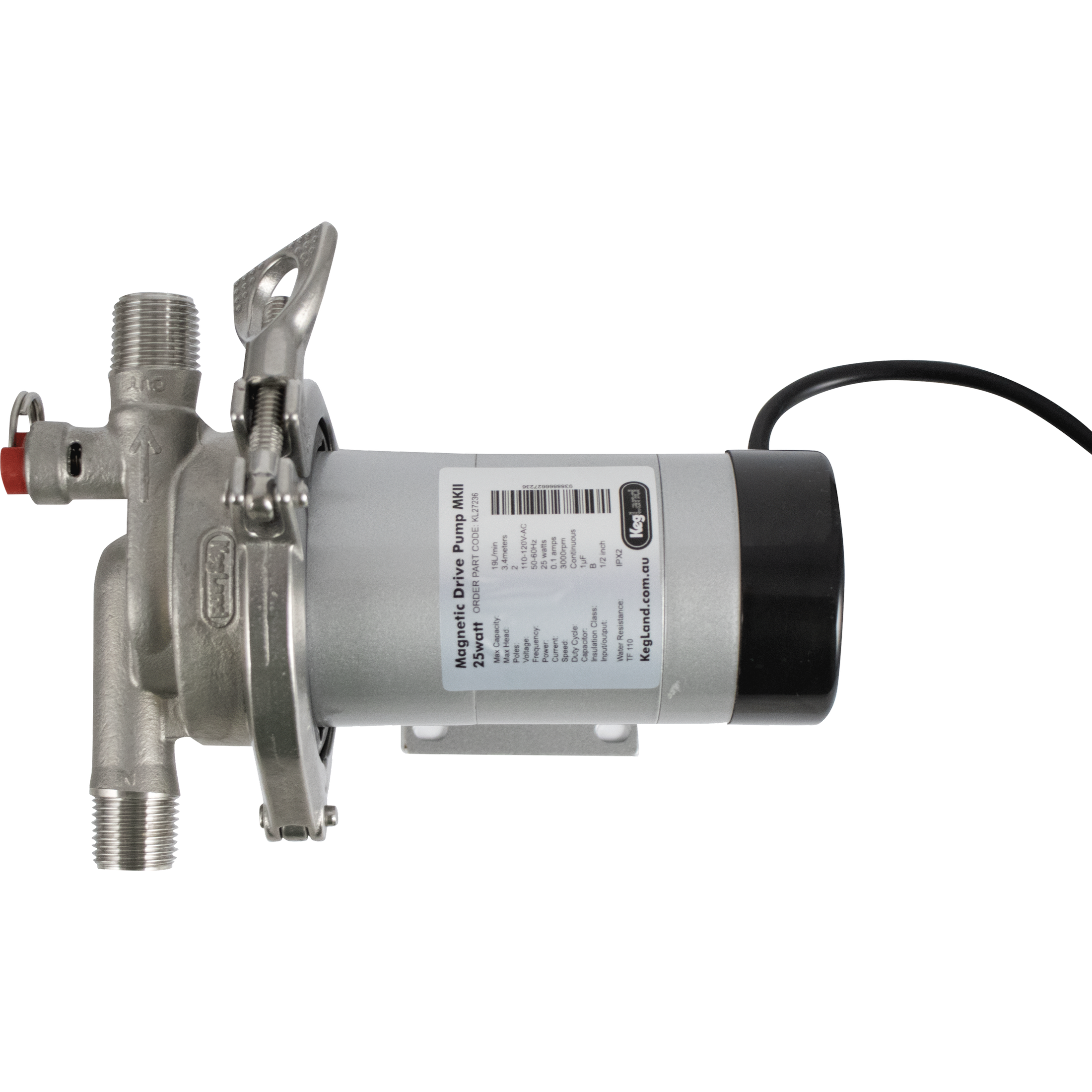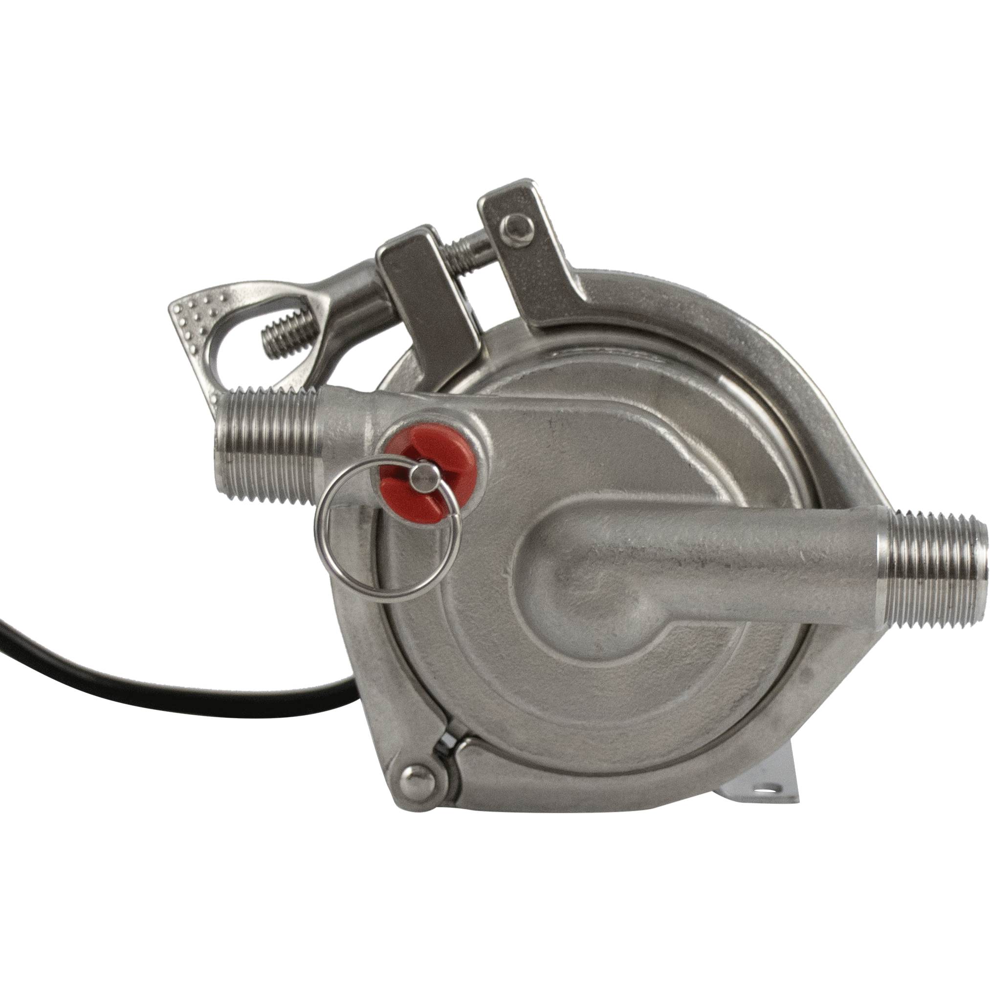 The best-selling MKII Magnetic Drive Pump now available with a major upgrade! This unit comes standard with an inline stainless steel pump head that installs on the pump body with a 3" tri-clamp. Compared to the standard "center inlet" pump head, the "inline" flow path can make it much easier to integrate into your brewery and keep your brewing hoses tidy. At the outlet of the pump, there is a very handy pull ring PRV that allows you to bleed liquor or wort from the pump head to release trapped air and prime the pump. And with the 3" T.C. connection, not only do you have a full 360-degrees to orient the pump head any which way, cleaning the pump after use could not be easier—just pop off the tri-clamp, wash out the pump head, and clamp back on.