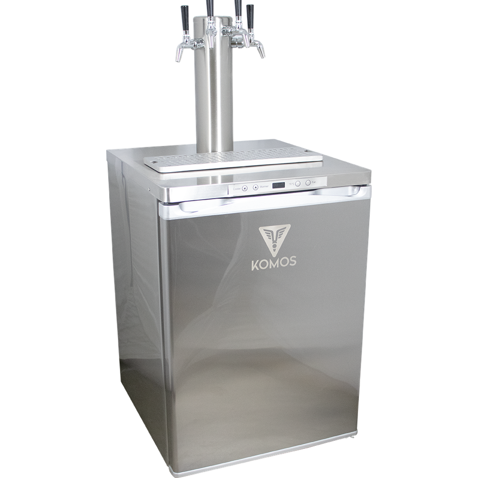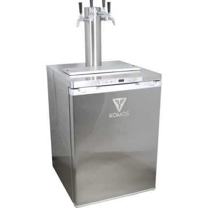 The KOMOS Kegerator offers a stunning set of features that clearly separate this unit as the most modern kegerator on the market. With more interior space than other models, the KOMOS Kegerator is designed to fit up to four 5-gallon Slimline Torpedo kegs or Pepsi-style Ball Lock Corny kegs. Whether you choose the single, double, triple, or quad tap configuration, you'll receive stainless steel forward-sealing faucets in either classic or flow control model. Stainless faucets are a huge upgrade over the chrome-plated brass faucets commonly included with other kegerators, and you'll quickly recognize the quality of a forward-sealing beer faucet compared to the standard taps seen at your local tavern or in-law's mancave. Rather than a chrome plated tower, the NukaTap faucets are mounted to a stainless steel tower that remains cool before, during, and after each pour thanks to a tower fan diverter that recirculates cold air within the kegerator and blows it up into the tower to keep your beer lines cold and reduce foaming. From keg to faucet, your beer will pass through EVABarrier draft lines, a premium double-walled tubing designed to protect against beer oxidation. And with Duotight push-to-connect fittings, you'll have your lines connected in a snap with no need to force the tubing over barb fittings or fiddle with hose clamps. Other features you'll love about the KOMOS Kegerator include its highly-efficient cooling capacity so you'll be serving ice cold beer even in the warmest temperatures, extra wide temperature range from 26–82°F, dual gas inlets at the back, aluminum internal floor, rolling casters, and the included KOMOS Dual Gauge CO2 regulator.