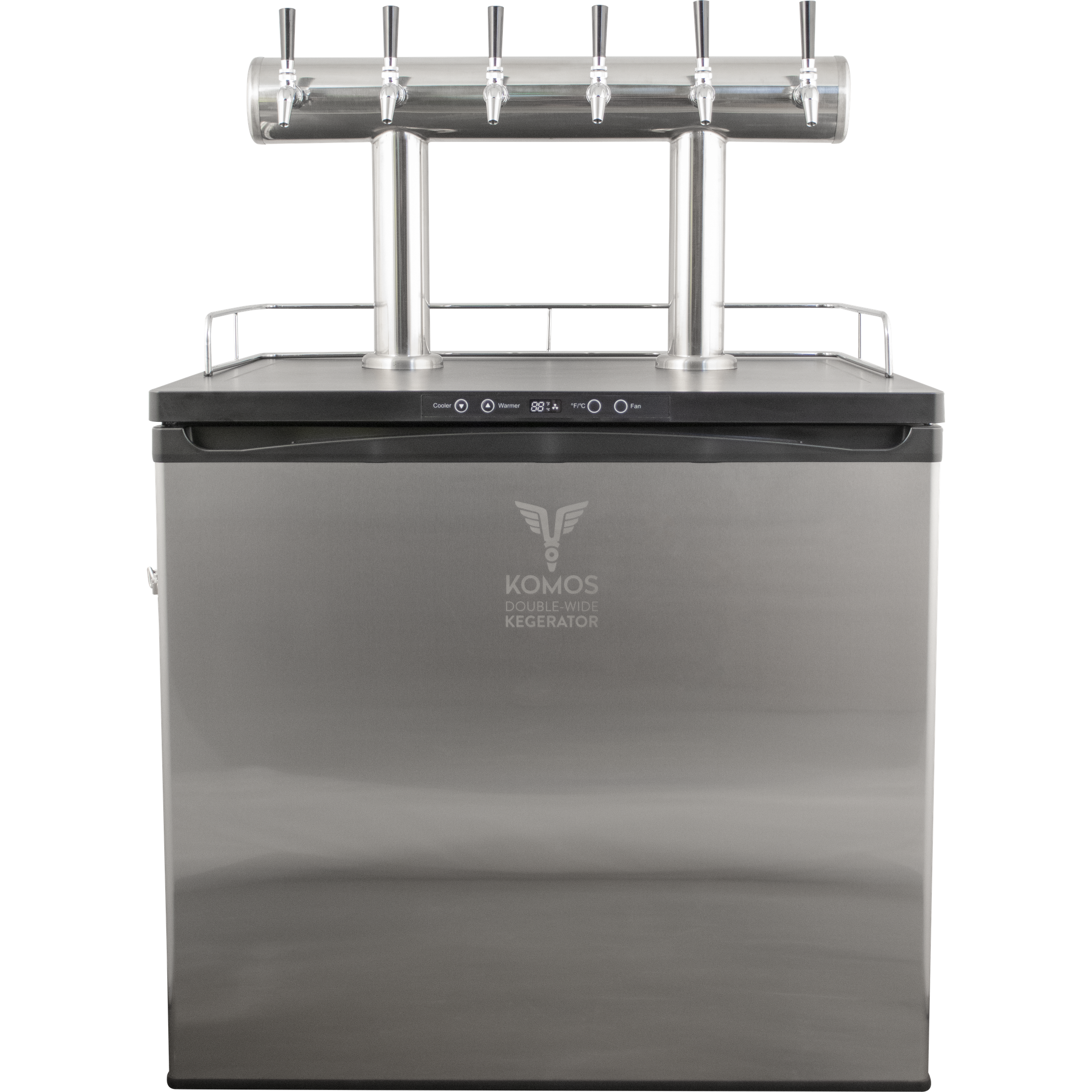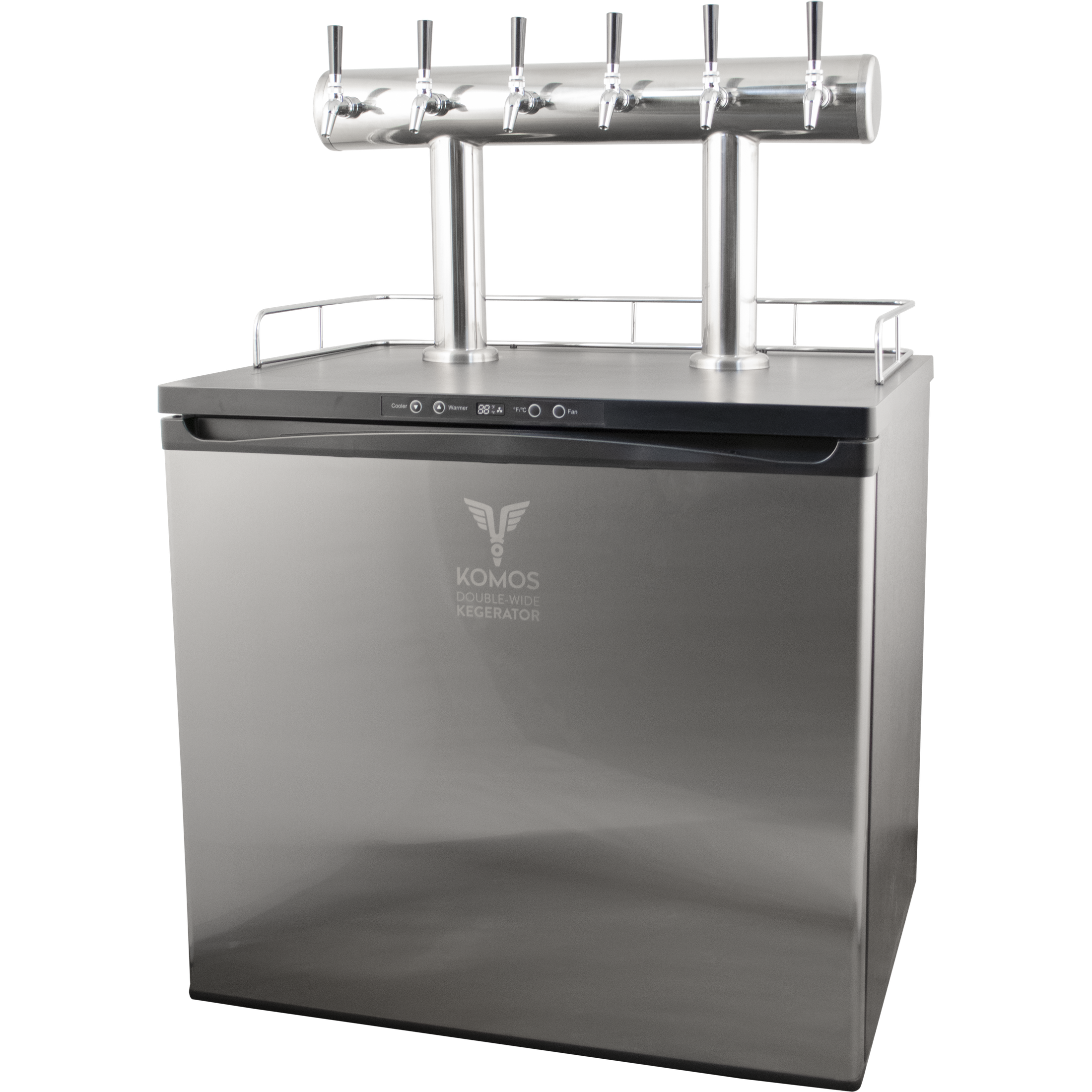 The KOMOS Double-Wide Kegerator offers the same stunning set of features that clearly separate the standard model as the most modern kegerator on the market. With more interior space than any other home kegerator model, the KOMOS Double-Wide Kegerator is designed to fit up to eight 5-gallon Slimline Torpedo kegs or Pepsi-style Ball Lock Corny kegs. Whether you choose the two tap or eight tap configuration, you'll receive tried-and-true Intertap stainless steel forward-sealing faucets. Stainless faucets are a huge upgrade over the chrome-plated brass faucets commonly included with other kegerators, and you'll quickly recognize the quality of a forward-sealing beer faucet compared to the standard taps seen at your local tavern or in-law's mancave. Rather than chrome plated towers, the Intertap faucets are mounted to two stainless steel towers that remain cool before, during, and after each pour thanks to a tower fan diverter that recirculates cold air within the kegerator and blows it up into the towers to keep your beer lines cold and reduce foaming. From keg to faucet, your beer will pass through EVABarrier draft lines, a premium double-walled tubing designed to protect against beer oxidation. And with Duotight push-to-connect fittings, you'll have your lines connected in a snap with no need to force the tubing over barb fittings or fiddle with hose clamps. Other features you'll love about the KOMOS Kegerator include its highly-efficient cooling capacity so you'll be serving ice cold beer even in the warmest temperatures, extra wide temperature range from 26–82°F, dual gas inlets at the back, stainless steel internal floor, rolling casters, and the included KOMOS Dual Gauge CO2 regulator.