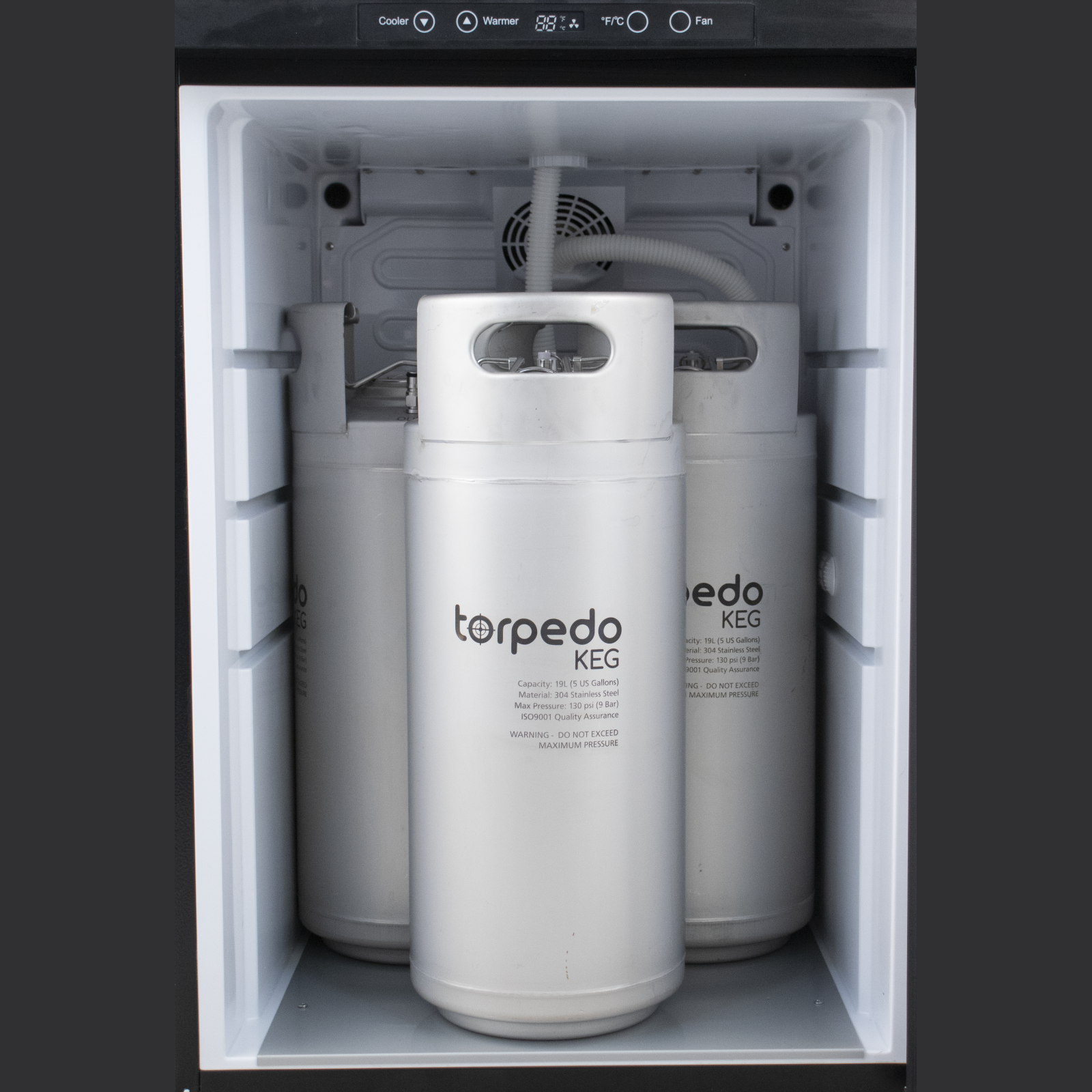 The most eye-catching difference between this unit and the previous model is definitely the capacity. This is the first kegerator we have offered that can fit up to four 5-gallon homebrew kegs at one time, and that’s all thanks to the redesigned interior. Most kegerators position the compressor on the right or left side of the inside floor, making one side shallower than the other. The KOMOS kegerator positions the compressor in the middle so both sides of the interior have an equal depth. This seemingly small detail allows the unit to hold up to four 5-gallon Slimline Torpedo or Ball Lock Corny kegs.