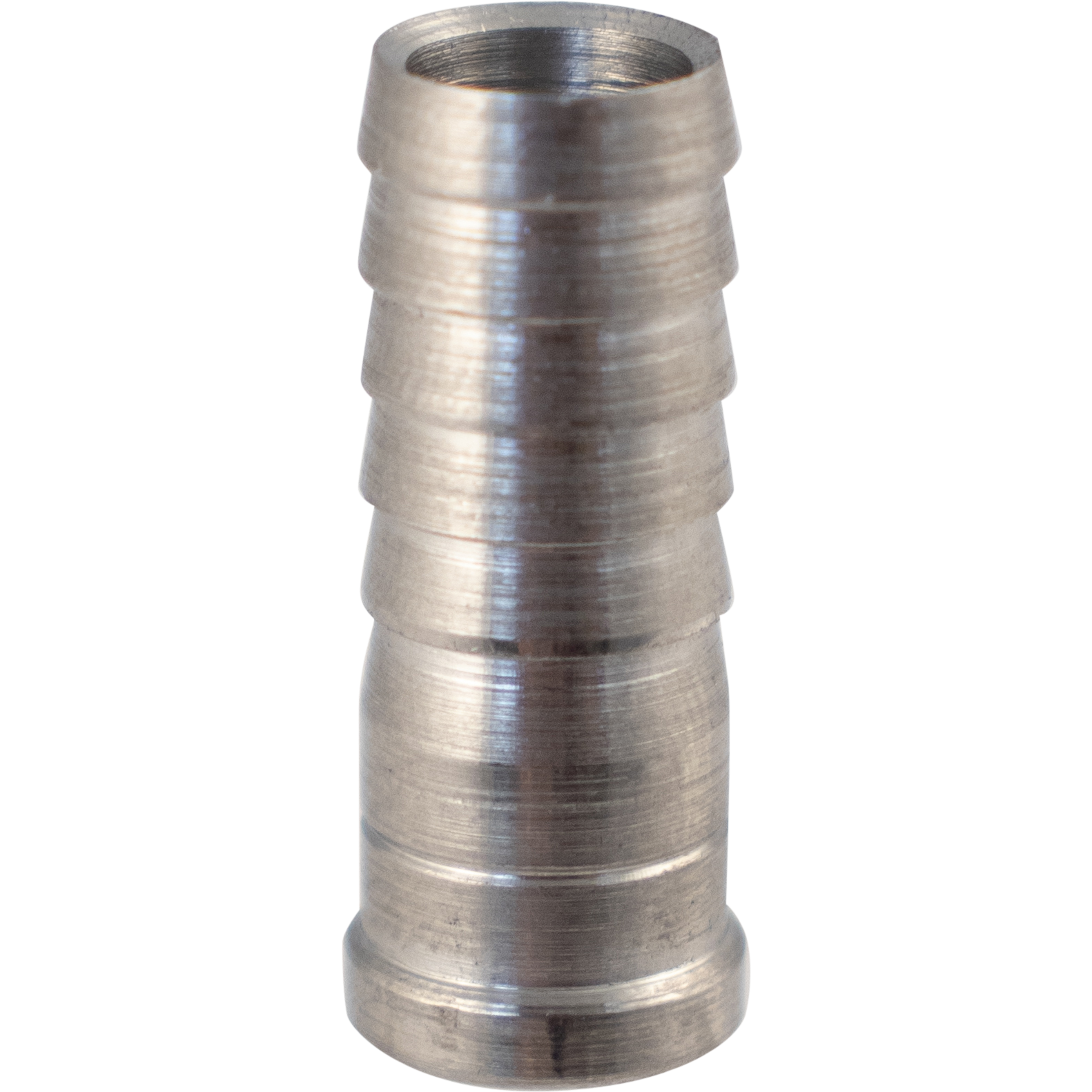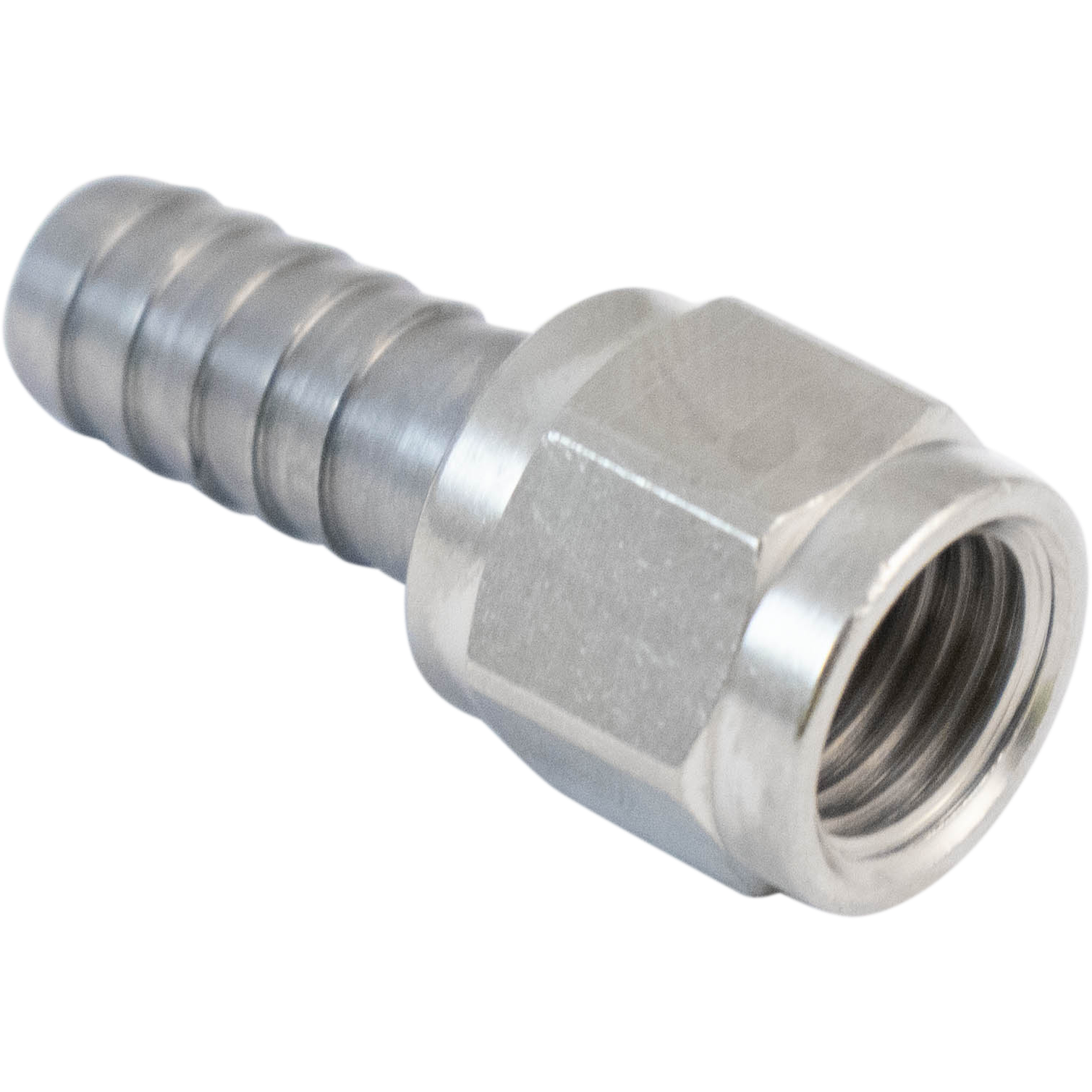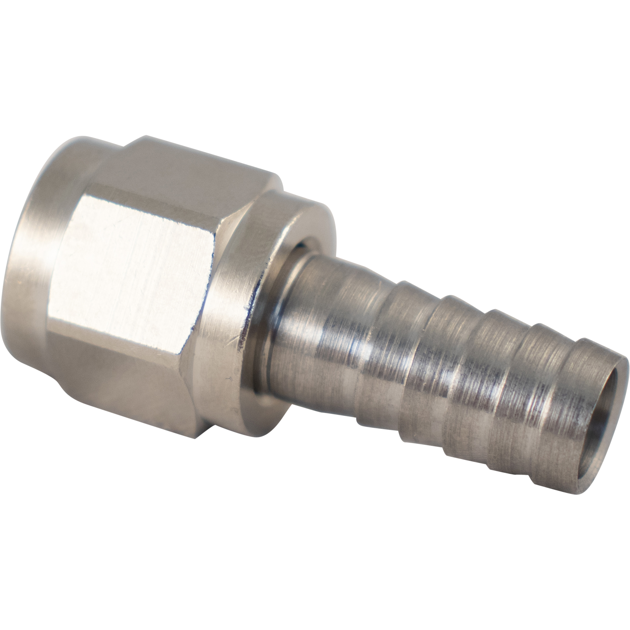 5/16 in. barb and 1/4 in. swivel nut for flare fitting connections. If you're connecting to stainless steel or brass, you will also need a nylon flare washer to form a seal. The barb is made from stainless steel. The nut is made from nickel plated brass.