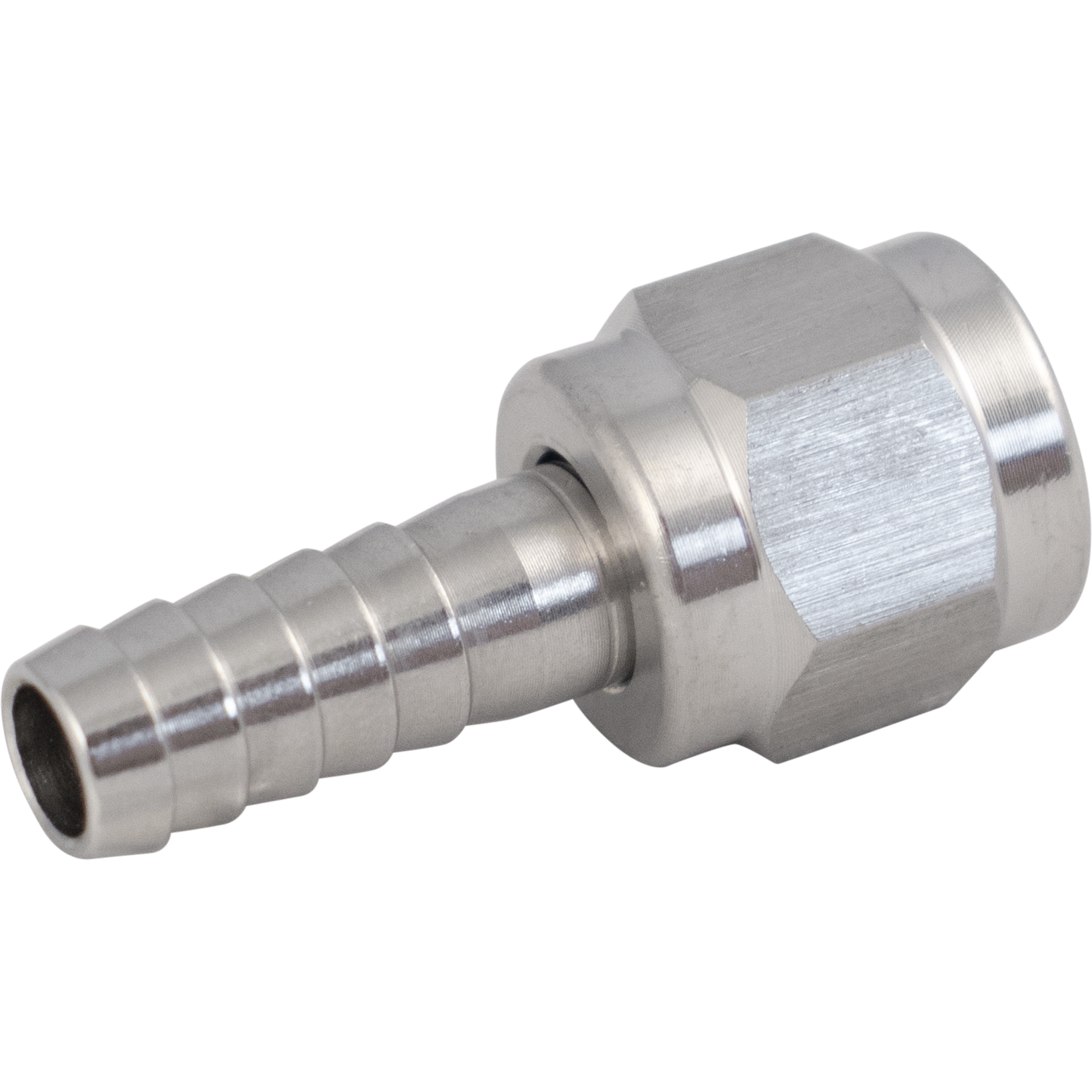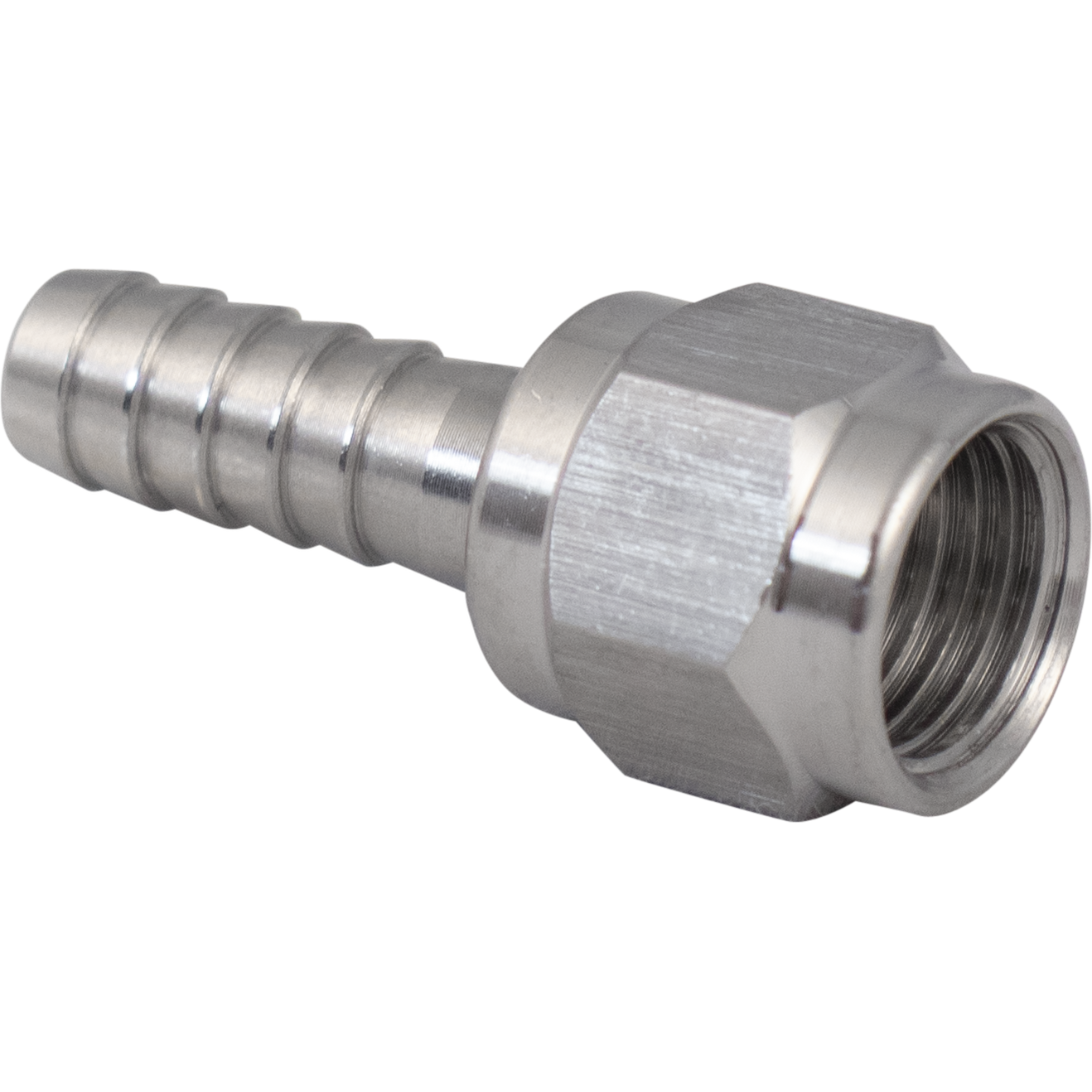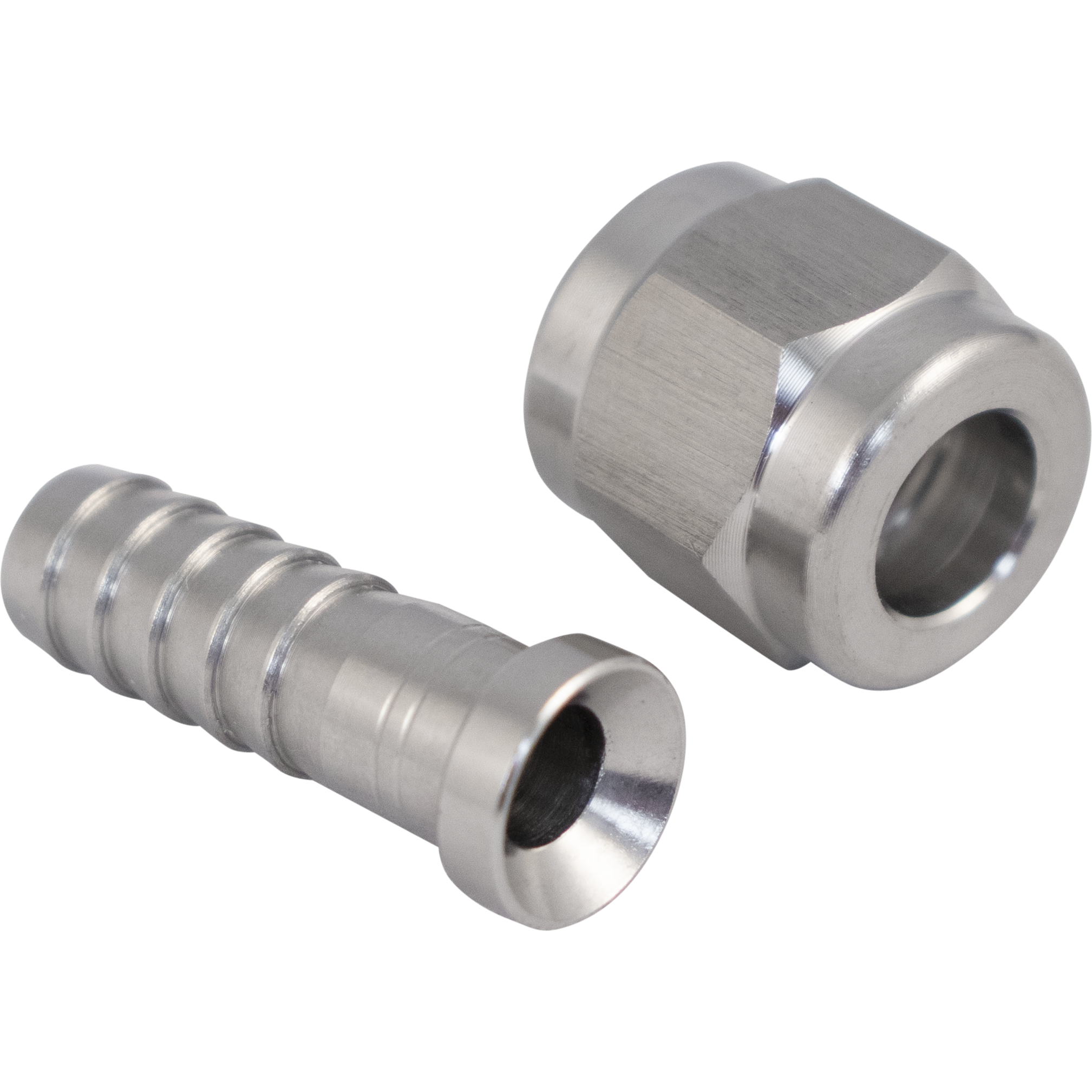 1/4 in. barb and 1/4 in. swivel nut for flare fitting connections. If you're connecting to stainless steel or brass, you will also need a nylon flare washer to form a seal. Plastic quick disconnects (QDs) on the other hand, have a built-in washer so the additional nylon flare washer is not needed. The barb and nut are both made from stainless steel.