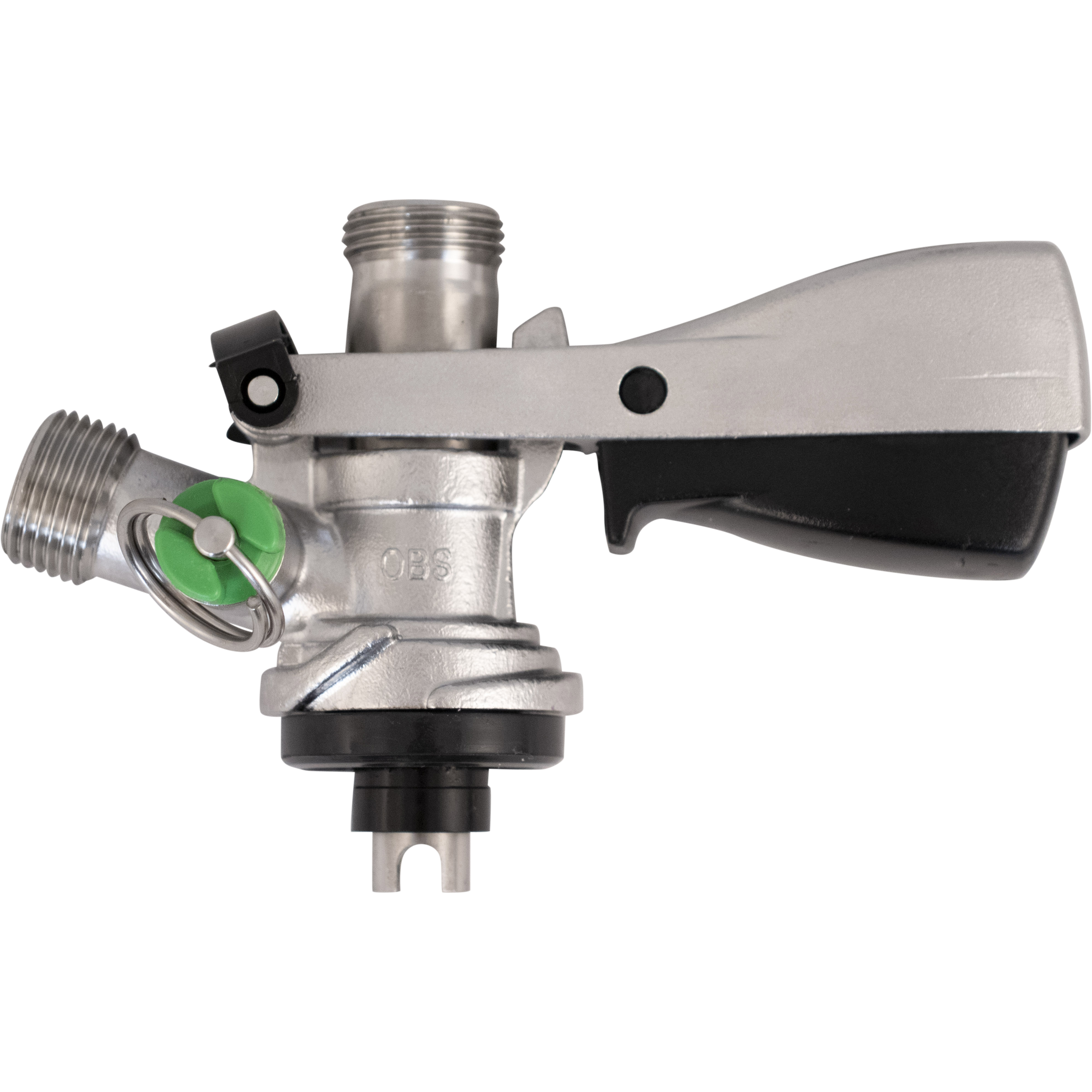KOMOS stainless S-Style beer tap for European brand kegs including Heineken, Newcastle, Pilsner Urquell, and Stella Artois. The coupler comes without fittings so it can be adapted however the user sees fit. When assembling, insert the rubber "duck bill" check valve into the side gas-in port. The check ball and ball retainer are placed in the top beverage-out port.