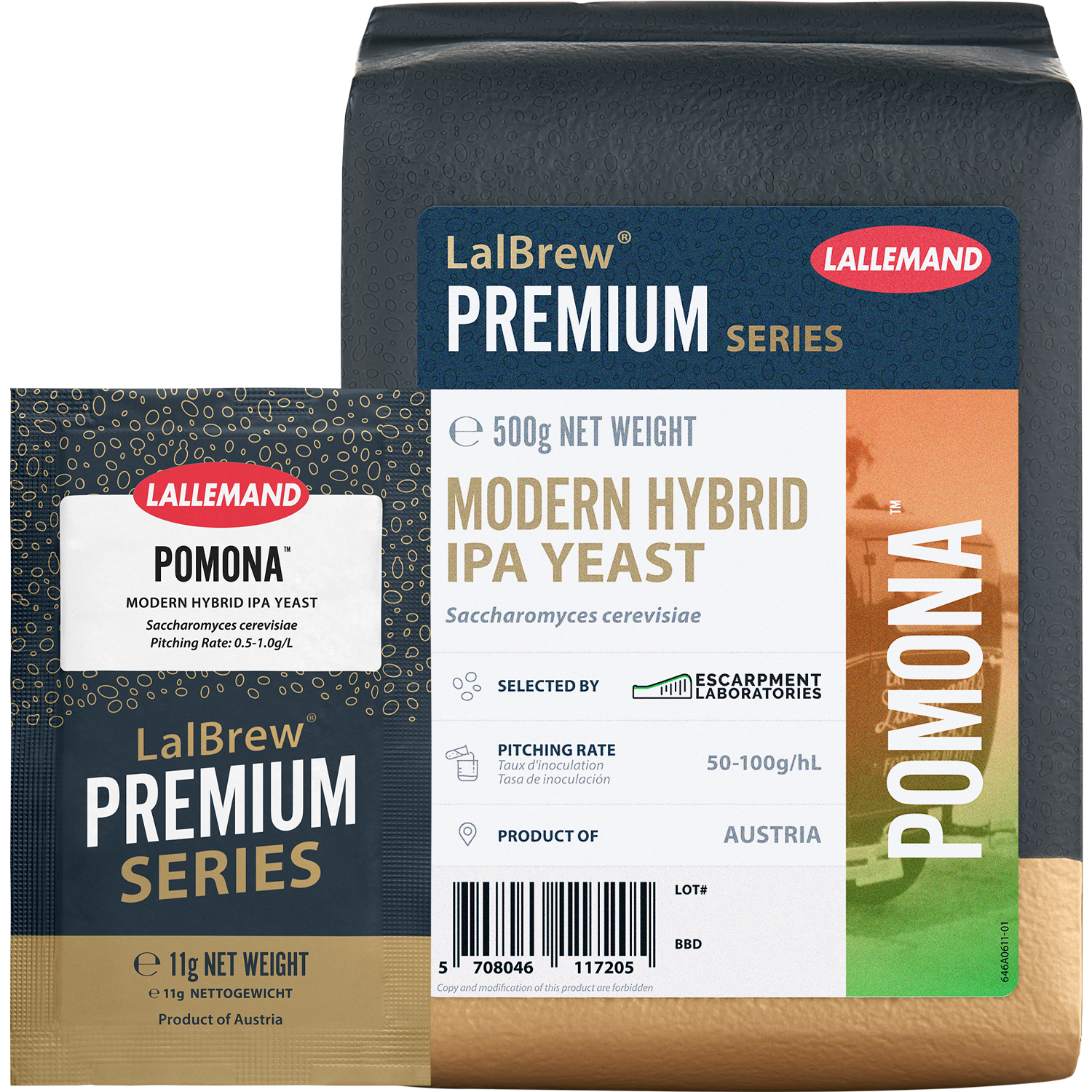 LalBrew Pomona™ is a hybrid yeast that was selected for flavor and fermentation performance in hoppy beers. Named after the goddess of fruit trees, LalBrew Pomona™ produces a unique and juicy flavor profile with notes of peach, citrus, and tropical fruits. This strain was developed by Lallemand's partner Escarpment Laboratories using advanced yeast breeding and adaptive laboratory evolution in high ABV and highly hopped IPA fermentations. Escarpment Laboratories is an innovative Canadian yeast company and industry leader in solution-based yeast development and hybridization. The result of this research and selection is a fruity, stress-tolerant, and robust strain that enhances biotransformation and haze for modern IPA styles.