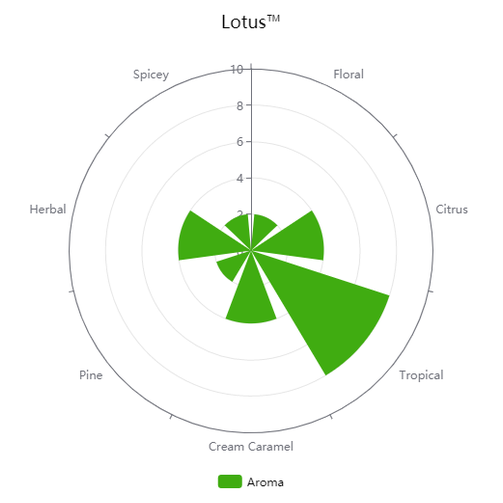 The majority of Lotus’s™ genetic origin stems from Eastern Gold, a Japanese variety dating back to the 1930s followed by a mix of Apollo, Cascade, and a USDA male. The USDA male was bred from an open pollinated seedling of a wild American hop developed at Wye College, England. The cross from the USDA male with Neomexicanus heritage adds an additional layer of complexity and uniqueness to this variety. Lotus™ offers exceptional aromatic characteristics, boasting waves of orange and vanilla followed by notes of candied grape and tropical fruit aromas.