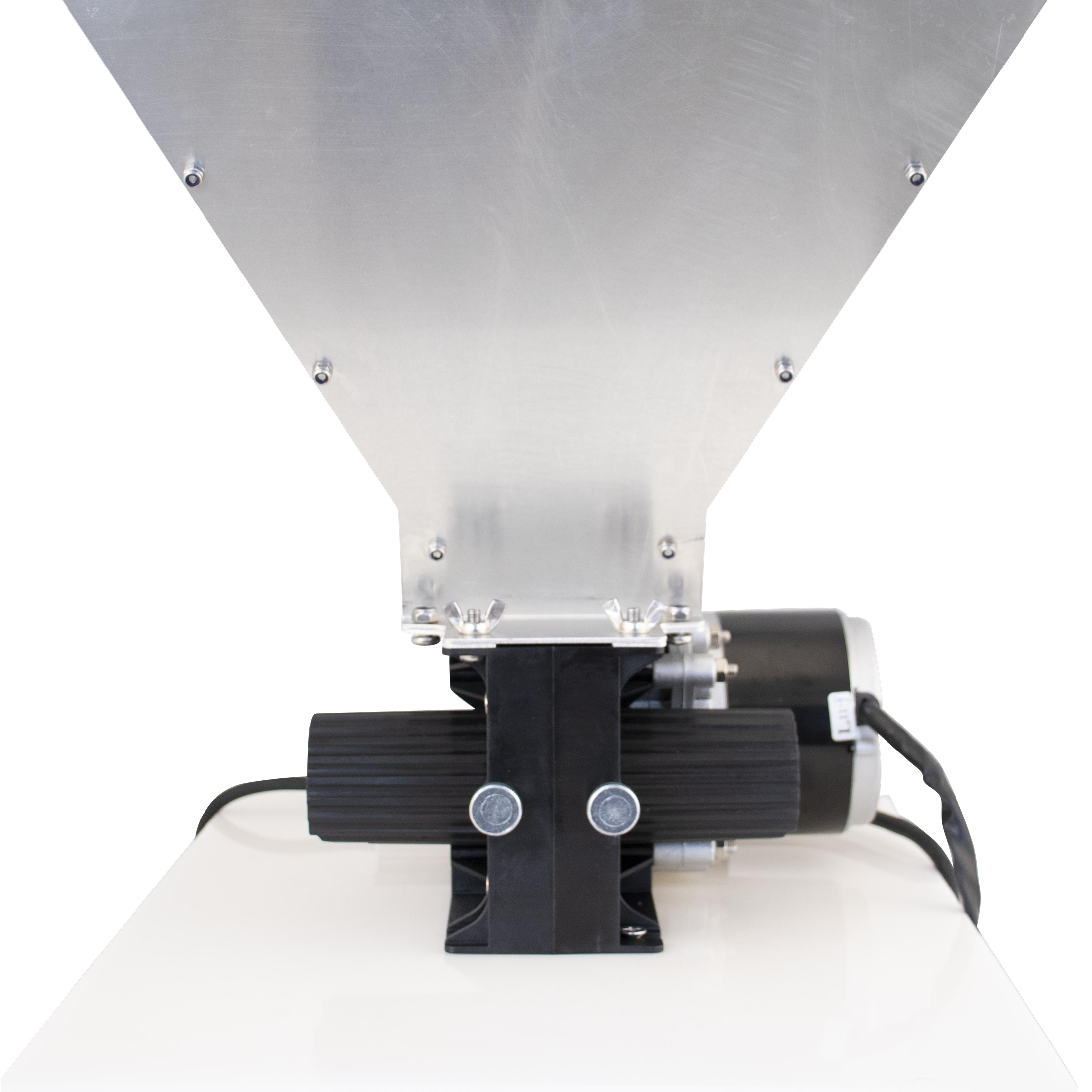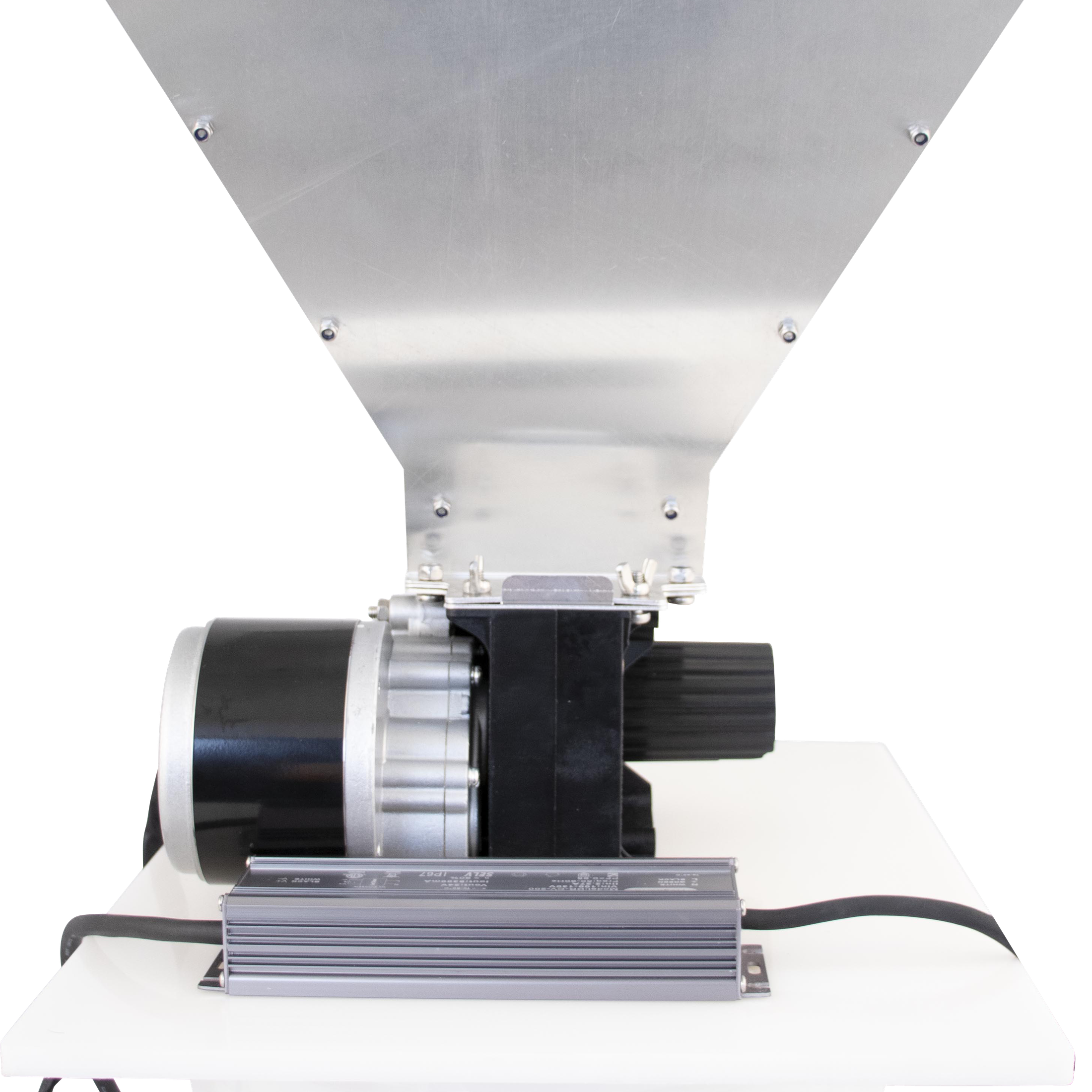 The motor is seamlessly integrated into the side body of the mill. Being DC, the motor is safer than higher voltage AC especially in an environment where washing down the area with a hose is likely to happen. The DC motor is also reversible so the direction of spin can be changed based on the polarity. This is particularly useful for over-mount and under-mount installation.