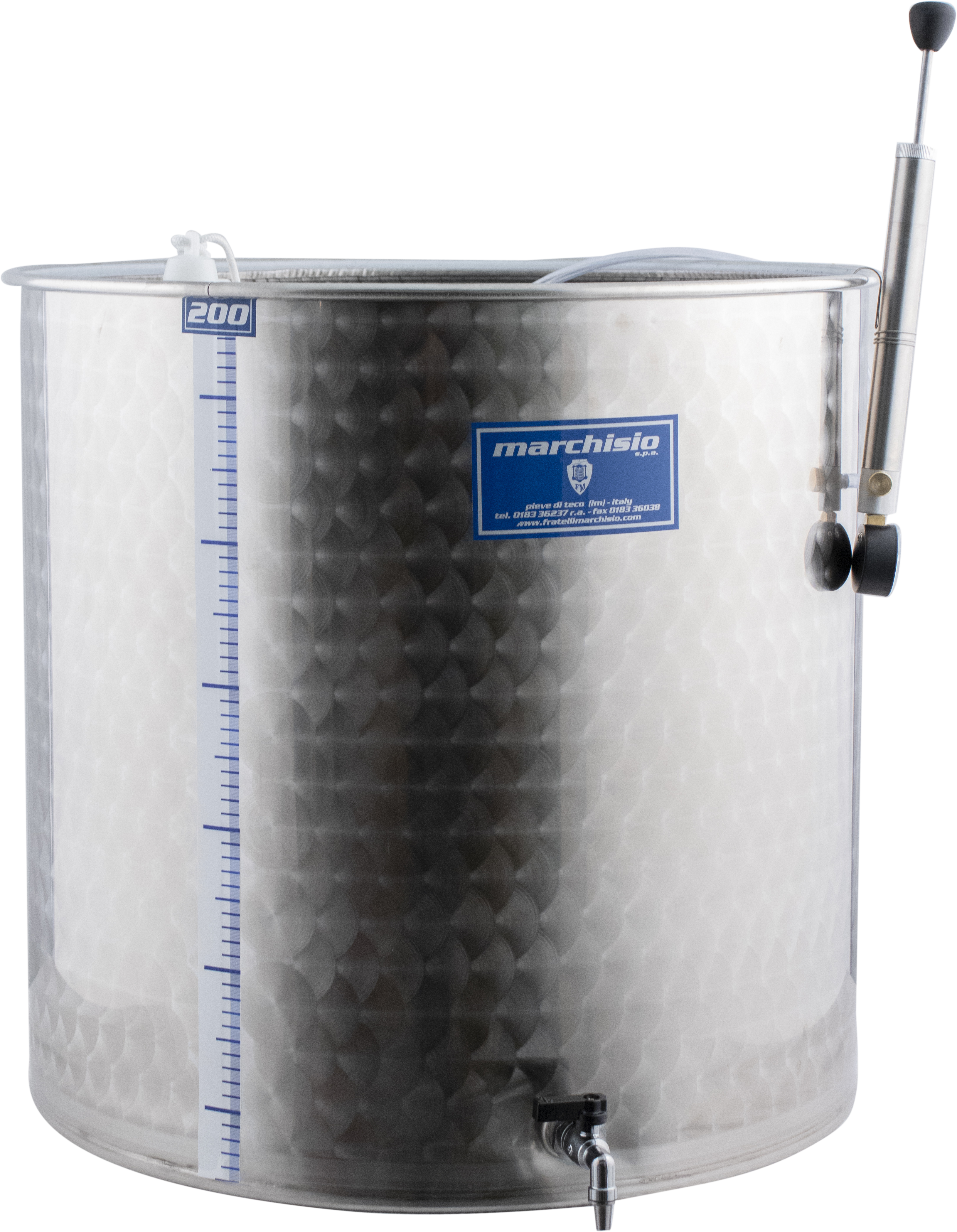 Variable Capacity tanks, also called Variable Volume tanks, made in Italy by Marchisio. This style of tank features a ‘floating’ lid with an inflatable gasket that can be positioned at any height in the tank. Use the included air pump to inflate the lid gasket. Whether you position the lid directly on the liquid, just above, or at the top of the tank is up to you. They are used as affordable stainless production tanks for applications ranging from winemaking to pickled foods and Kombucha.