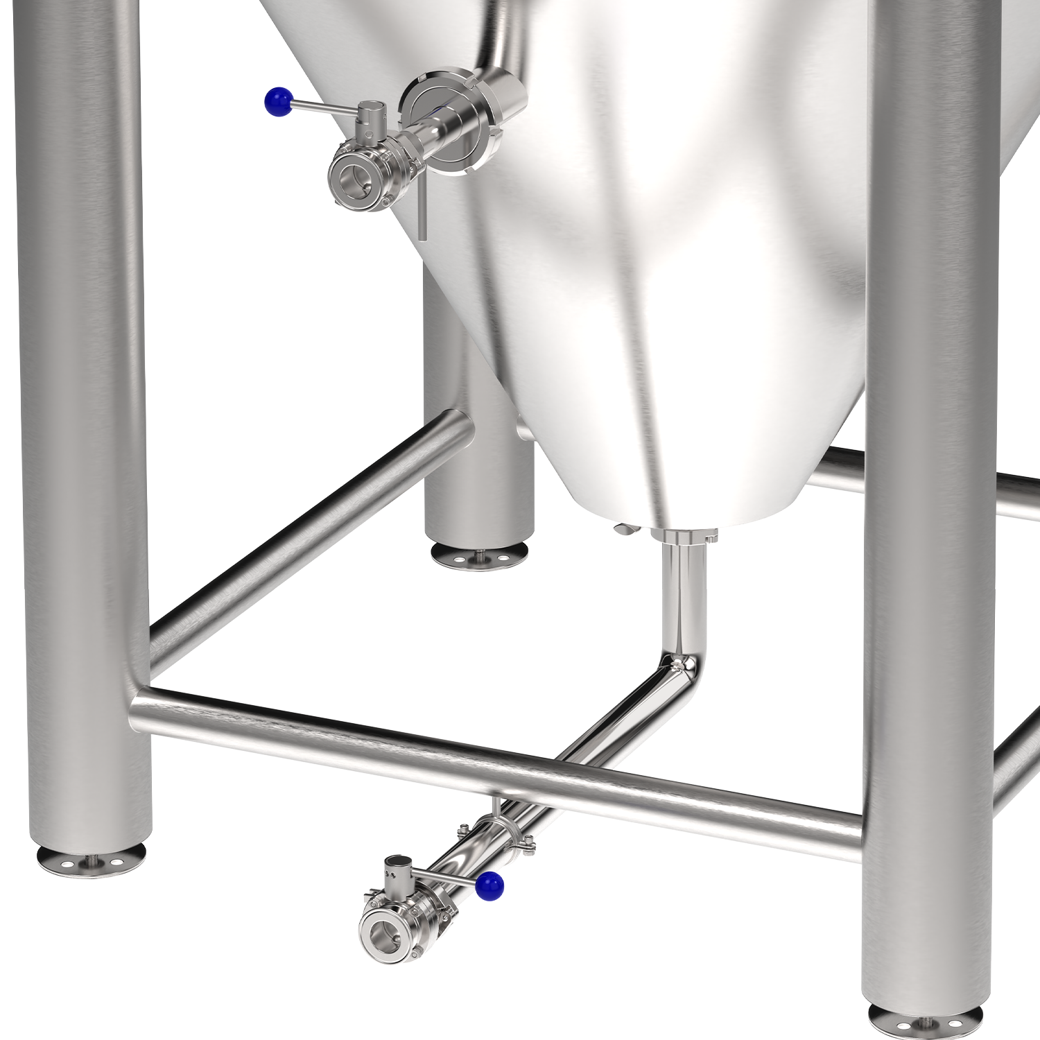 • All ports are 1.5" TC except for 4" TC Lid Hopping Port, 4" TC CIP Port (inner 1.5" TC to CIP ball adapter), 2" TC PVRV, 2" TC Drain Outlet, 2" TC Pressure Gauge, DIN 65 Rotating Racking arm (w/ 1.5" pipe), and 3/4" NPT Glycol Ports