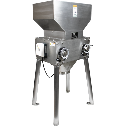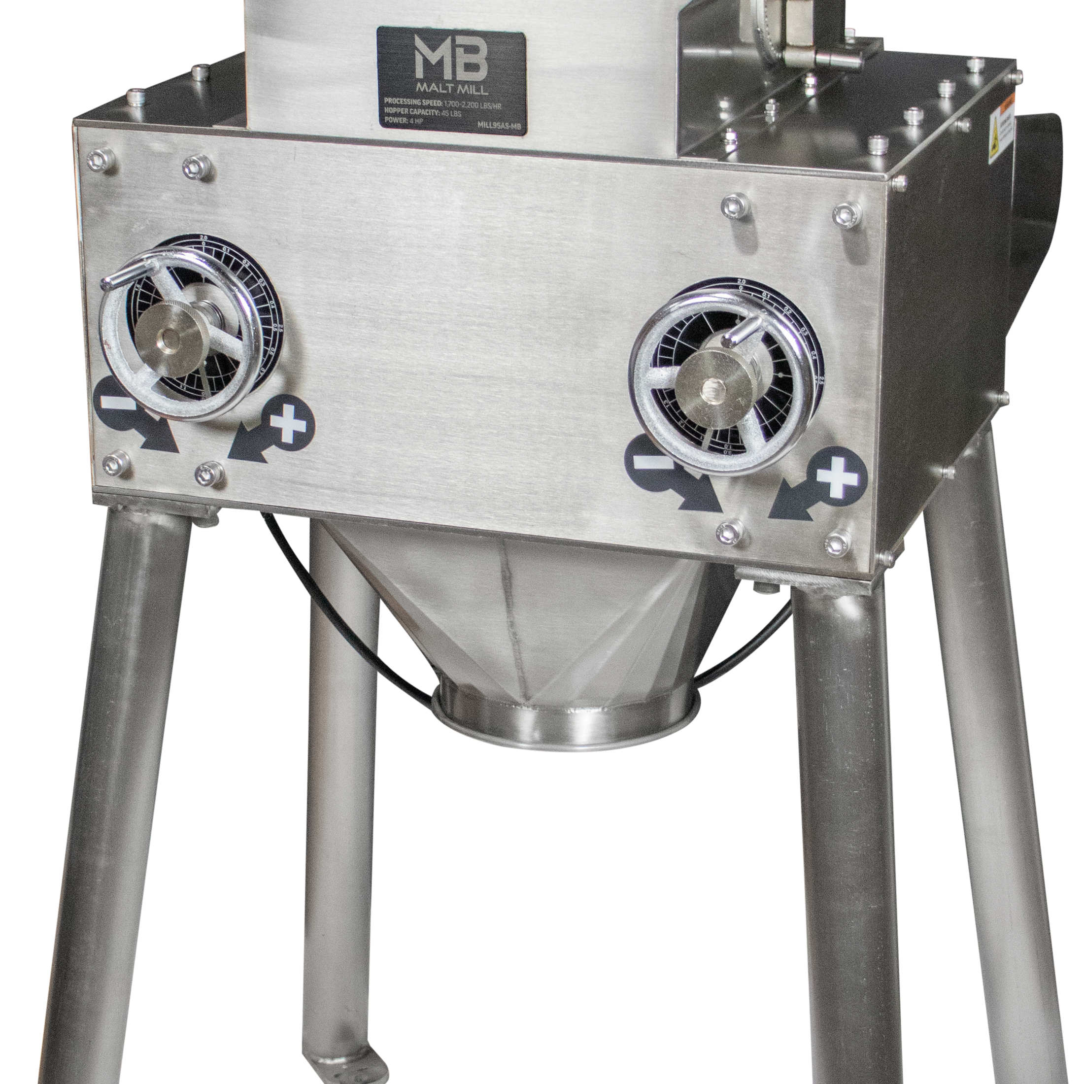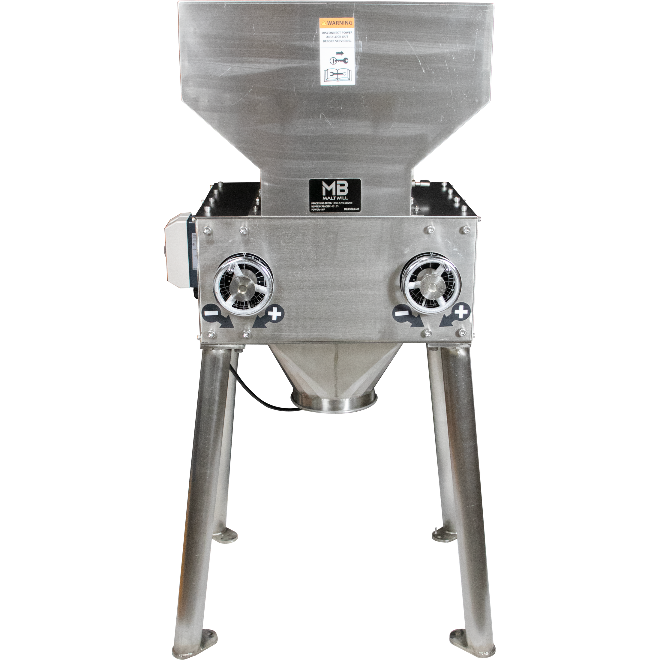 The MB pro mill is an industrial workhorse and the best value for a commercial mill on the market. The hopper capacity is 45 lbs of grain and large adjustment wheels make for easy gap adjustments. Stainless steel construction throughout, and anchor holes in the feet allow the unit to be bolted to the ground.