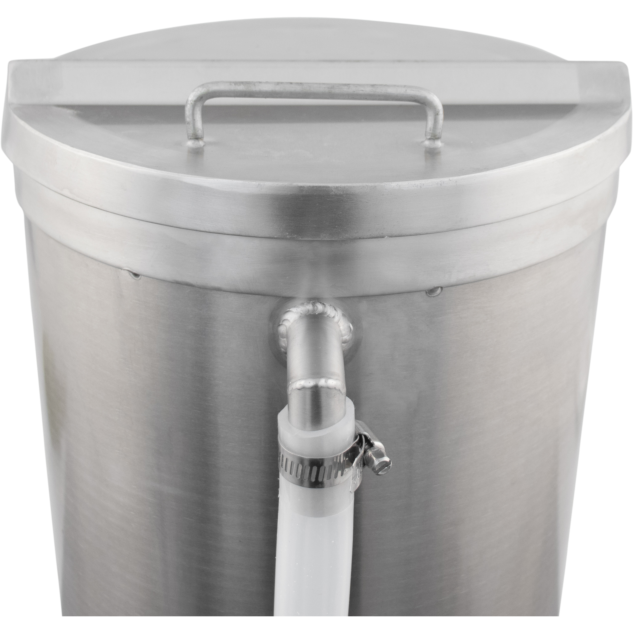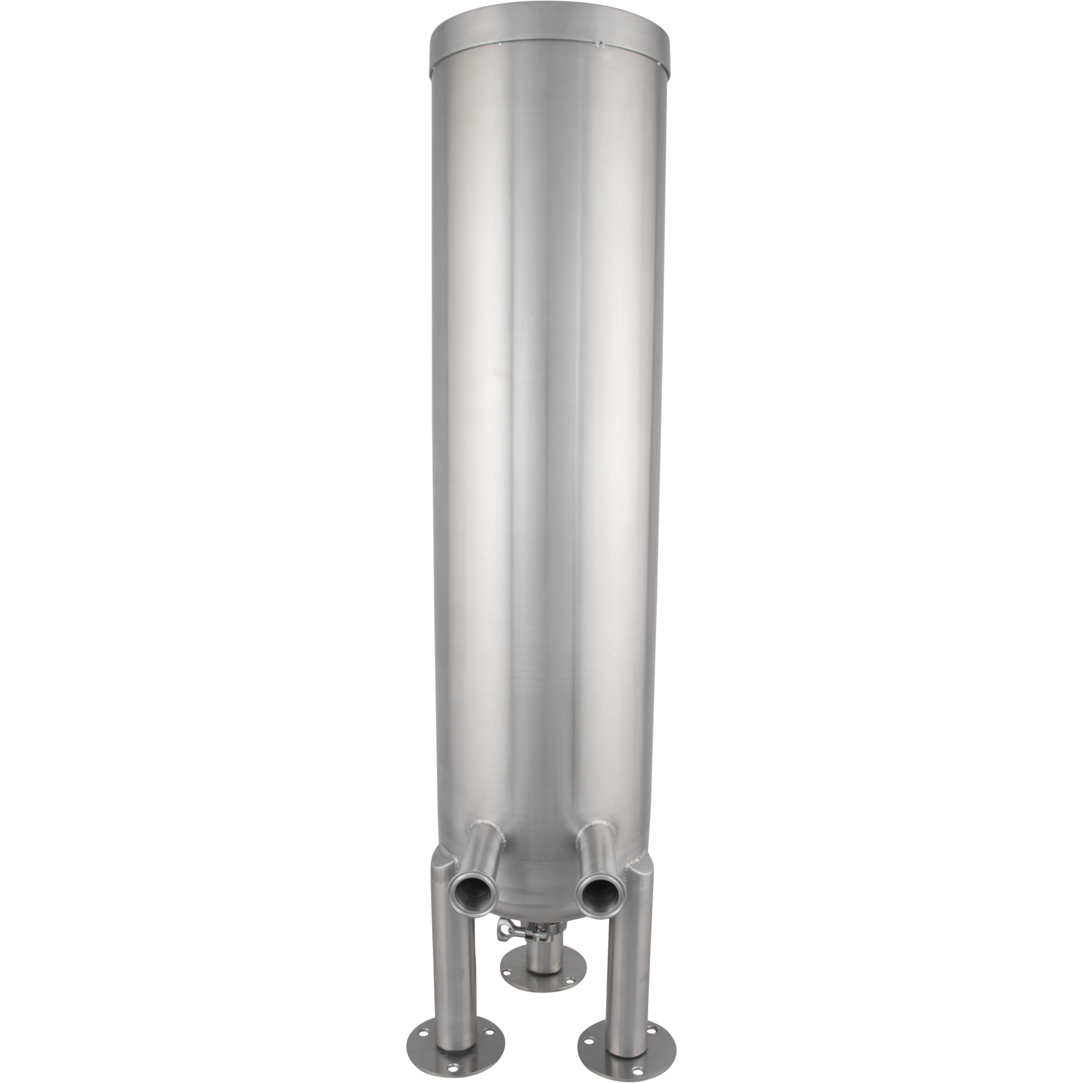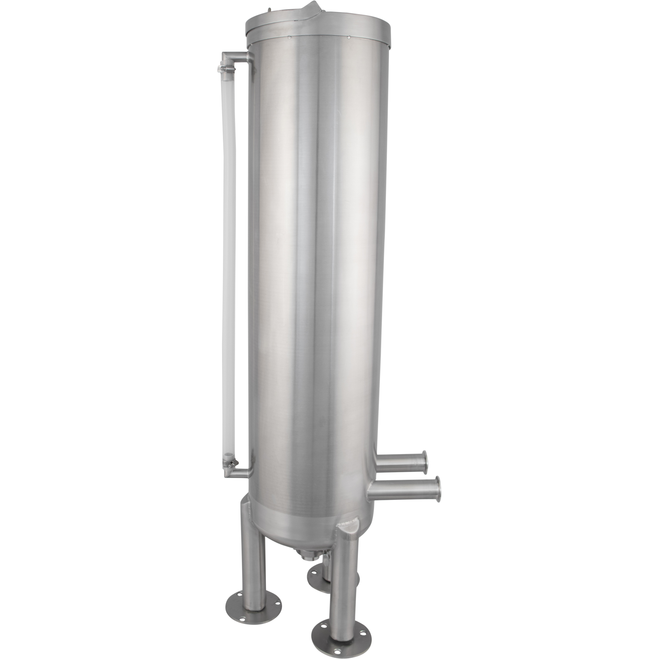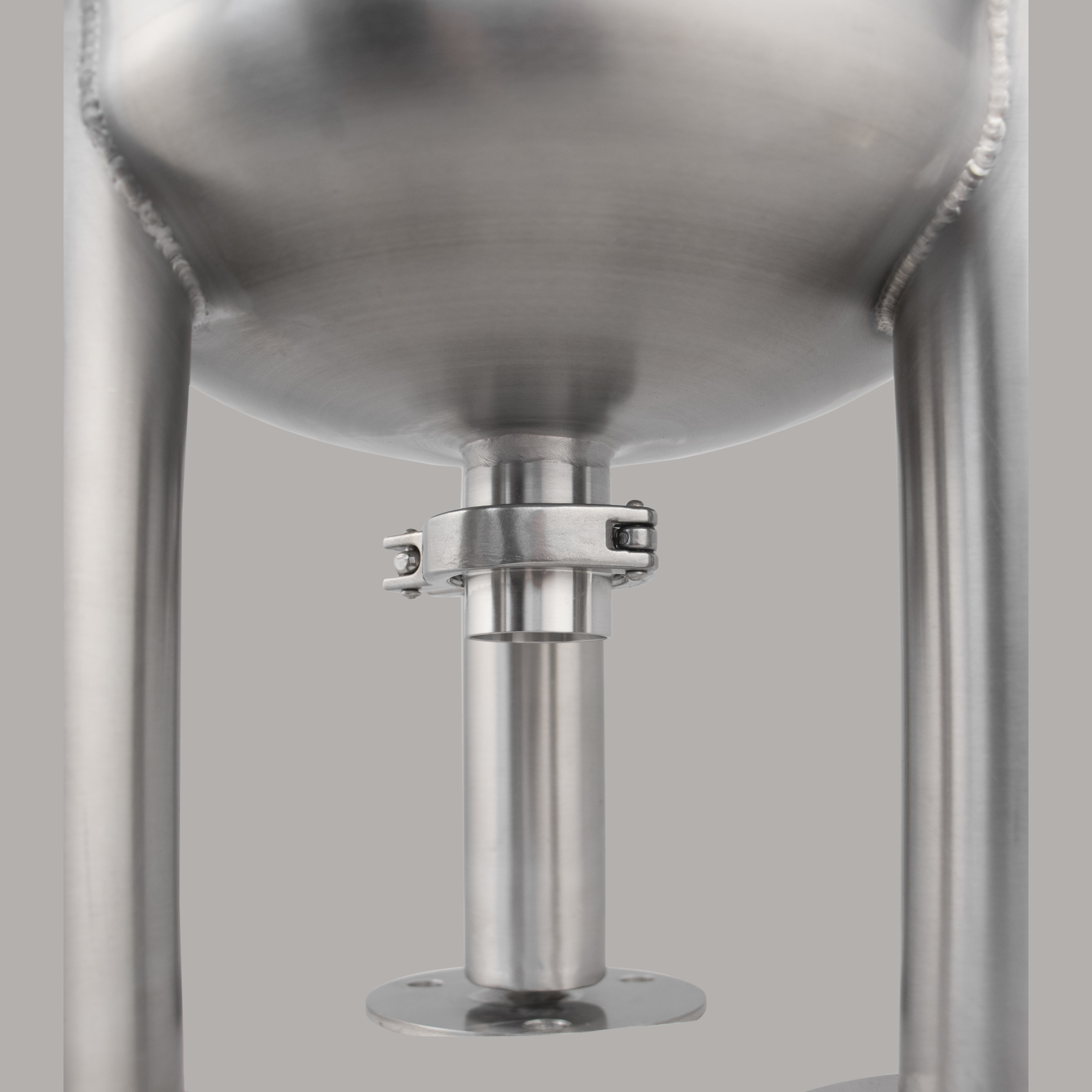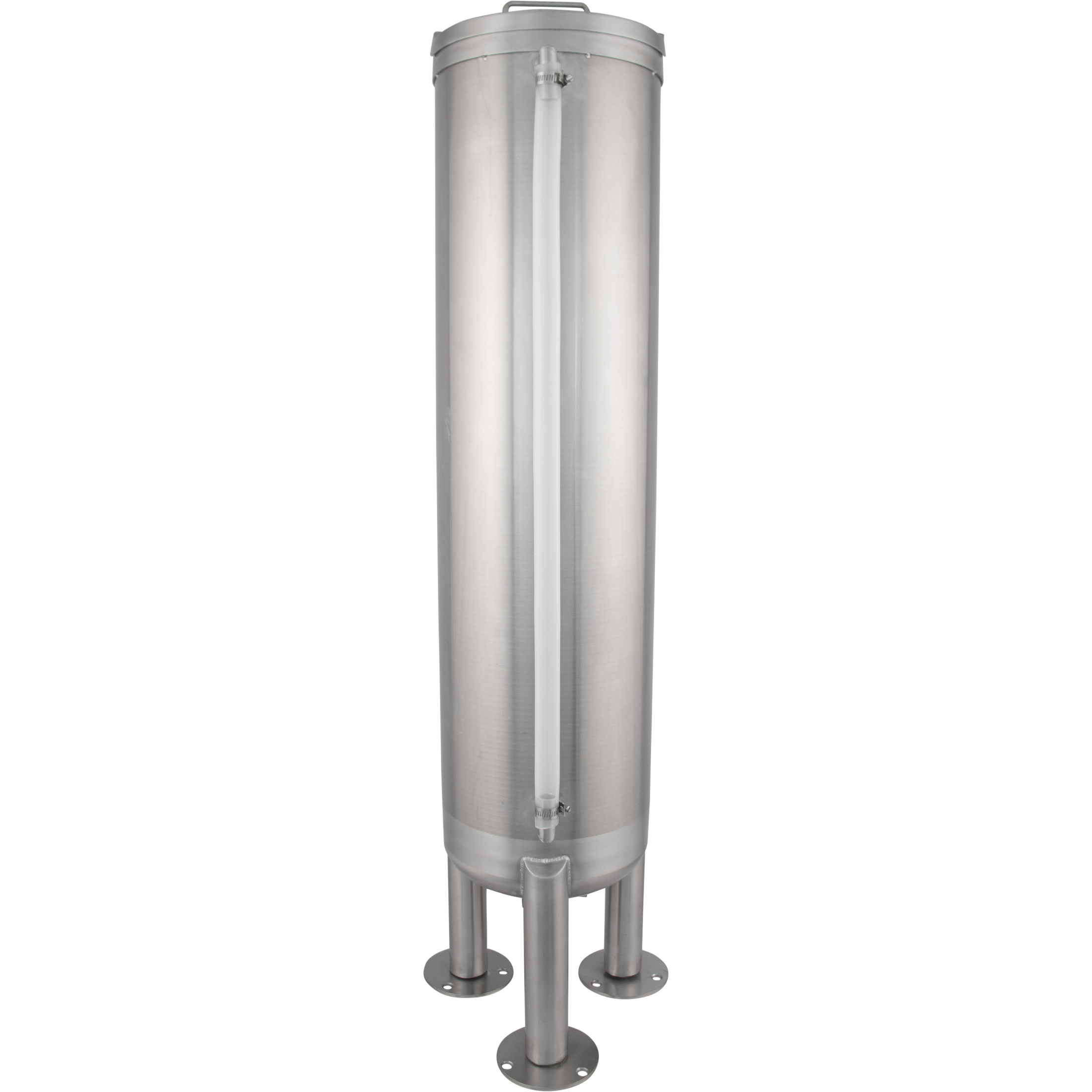 This tall cylindrical grant has three 1.5" tri-clamp ports and a silicone tube for a sight glass. The narrow design helps to reduce surface area and hot side aeration. The inlet and outlet side ports are raised a few inches above the conical dish bottom dump, which helps to separate grain sediment from the wort.