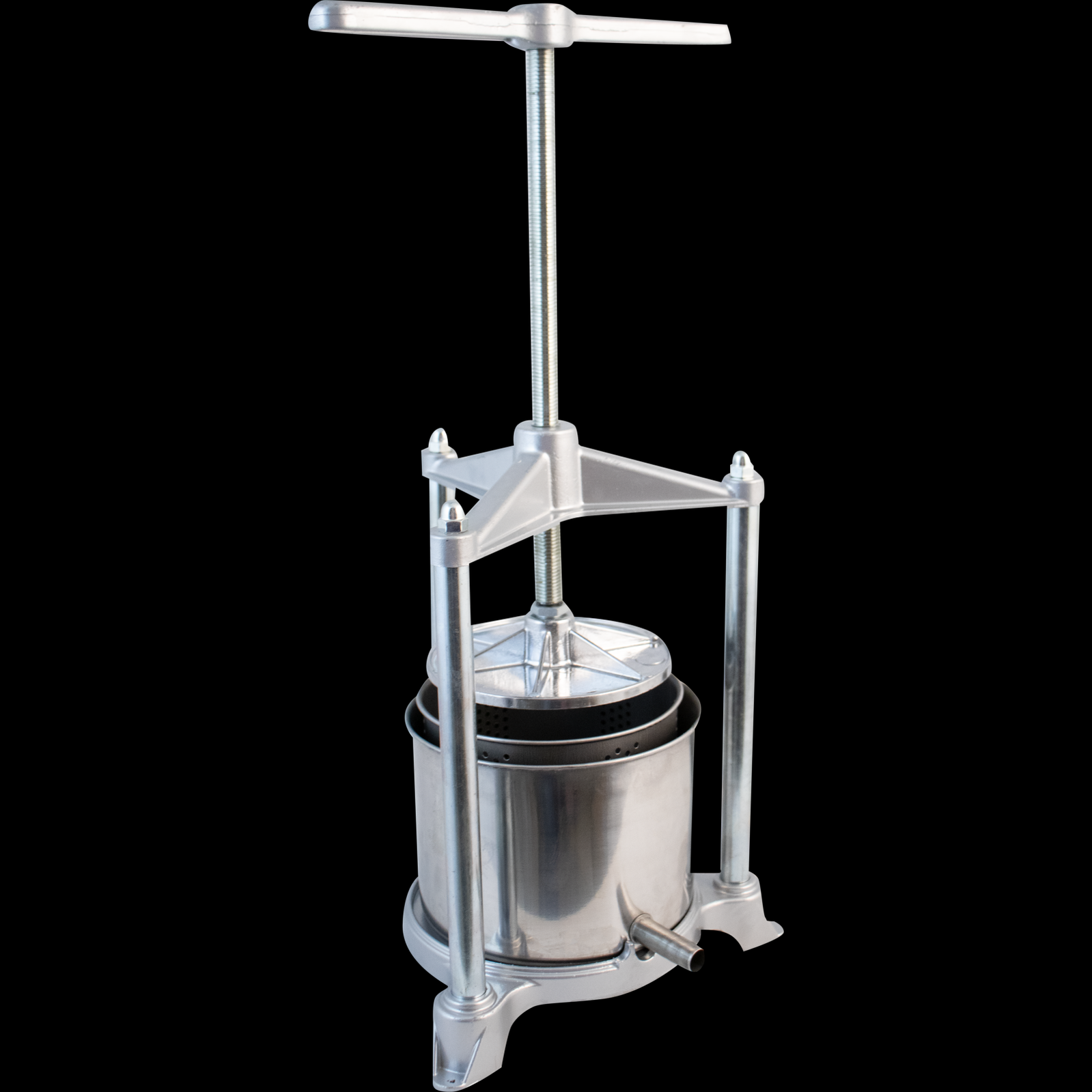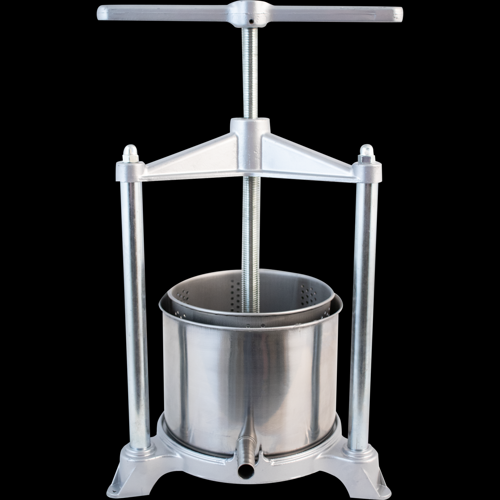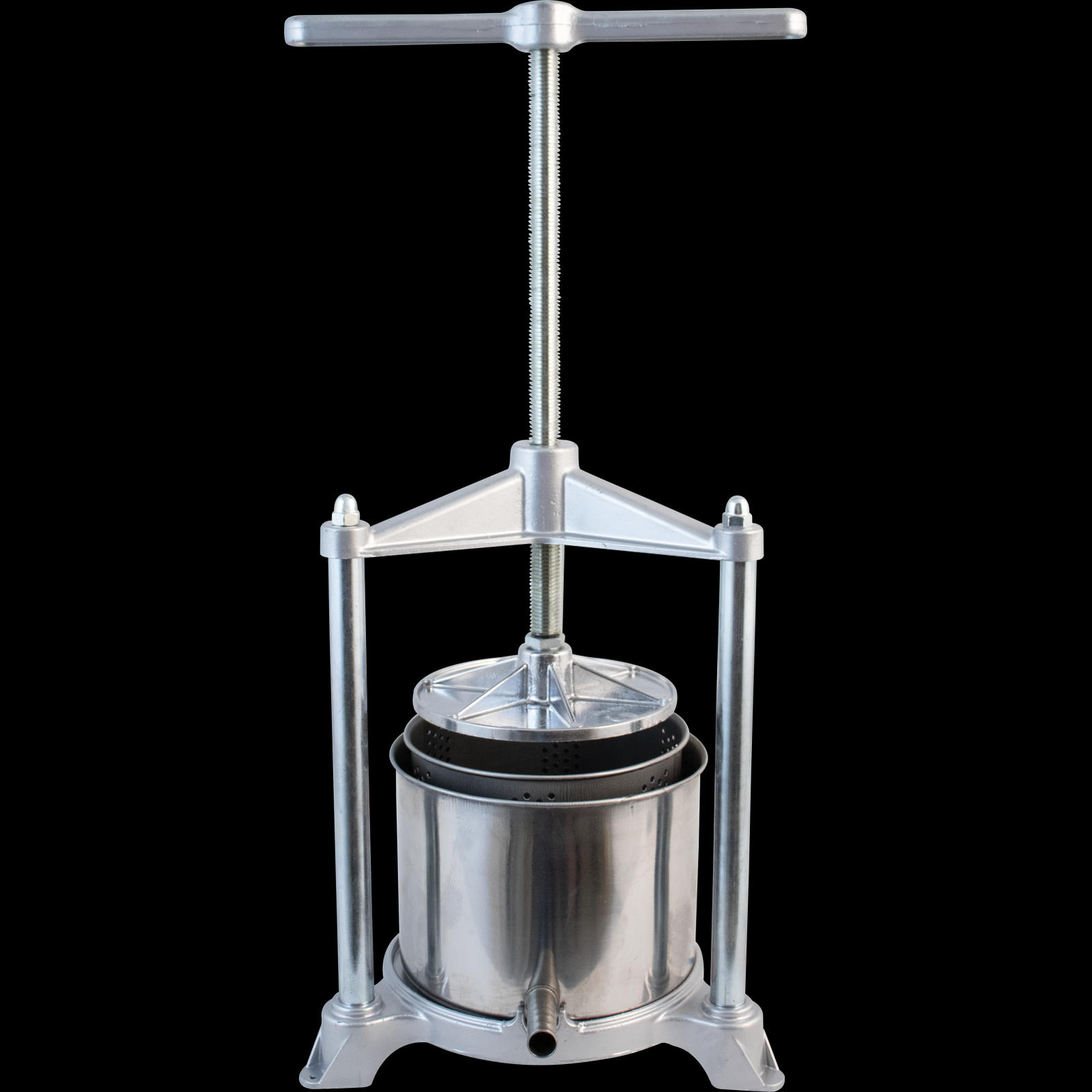 Our Medium Fruit Press is great for pressing small quantities of fruit, herbal tinctures, butter, cheese, and more. The stainless steel perforated basket keeps the product in, while the outer basin with pour spout directs the liquid to your collection container. The perforated basket and outer basin are made of stainless steel. The pressing plate and base are made from aluminum.