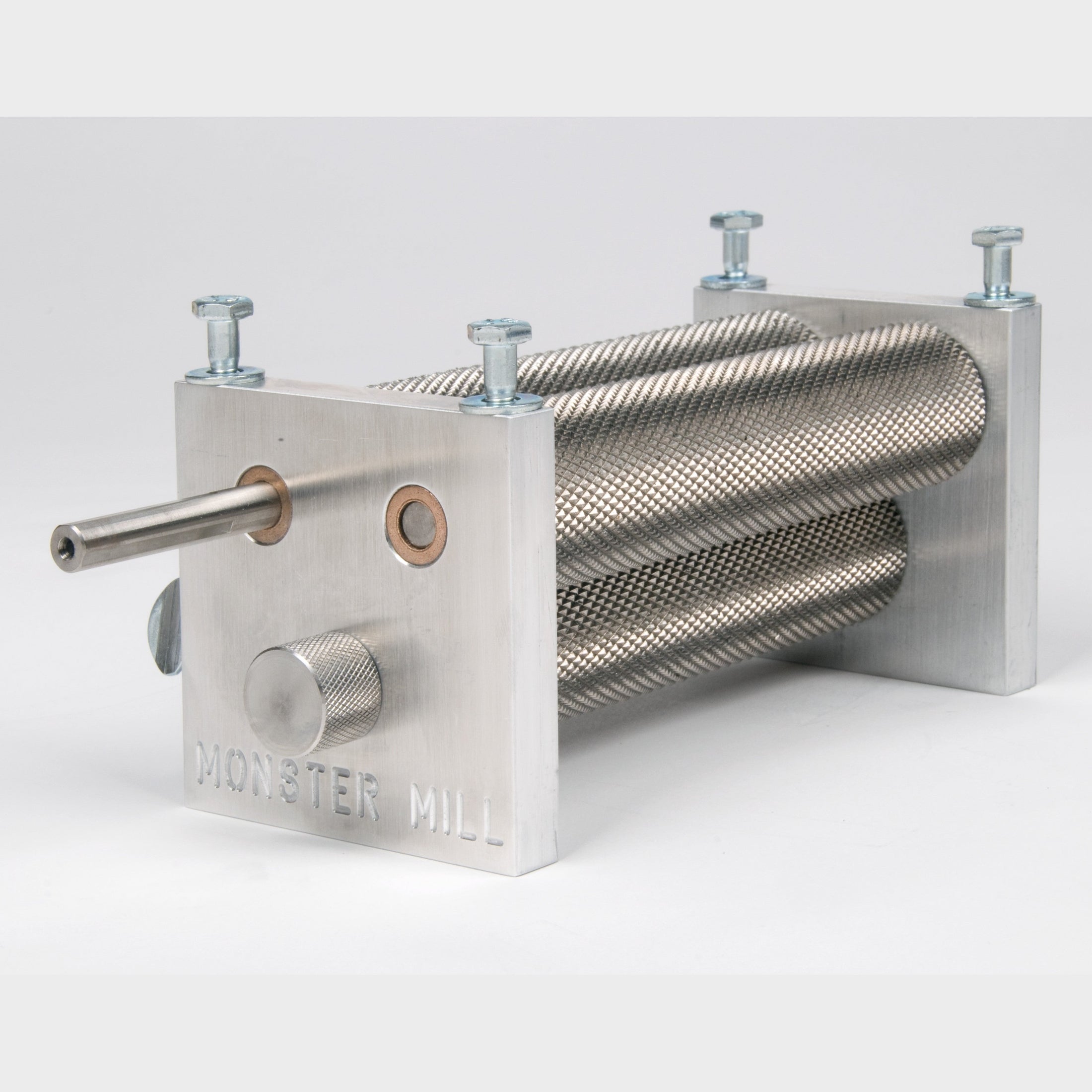 One knurled steel roller is driven by a standard electric drill (not included) to feed the grain through the initial fixed gap of approximately .060", and then through the adjustable secondary gap and crush the grist. Both ends of the non-driven top idler roller ride in bronze bushings that are pressed into the frames, while the second idler roller rides in bushings that are offset mounted in an adjustable knob. The knob is held in a fixed position by a set-screw that you can loosen to adjust the mill. This system provides an adjustment range of .065". Our knobs are made from 303 stainless steel for excellent durability, and are larger in diameter than the competition, as well as knurled for a positive grip. We've also added a groove in our newest design knobs with a matching rounded head on the thumbscrew that allows for a much better grip on the knob to avoid gap changes while milling, and also providing knob retention.