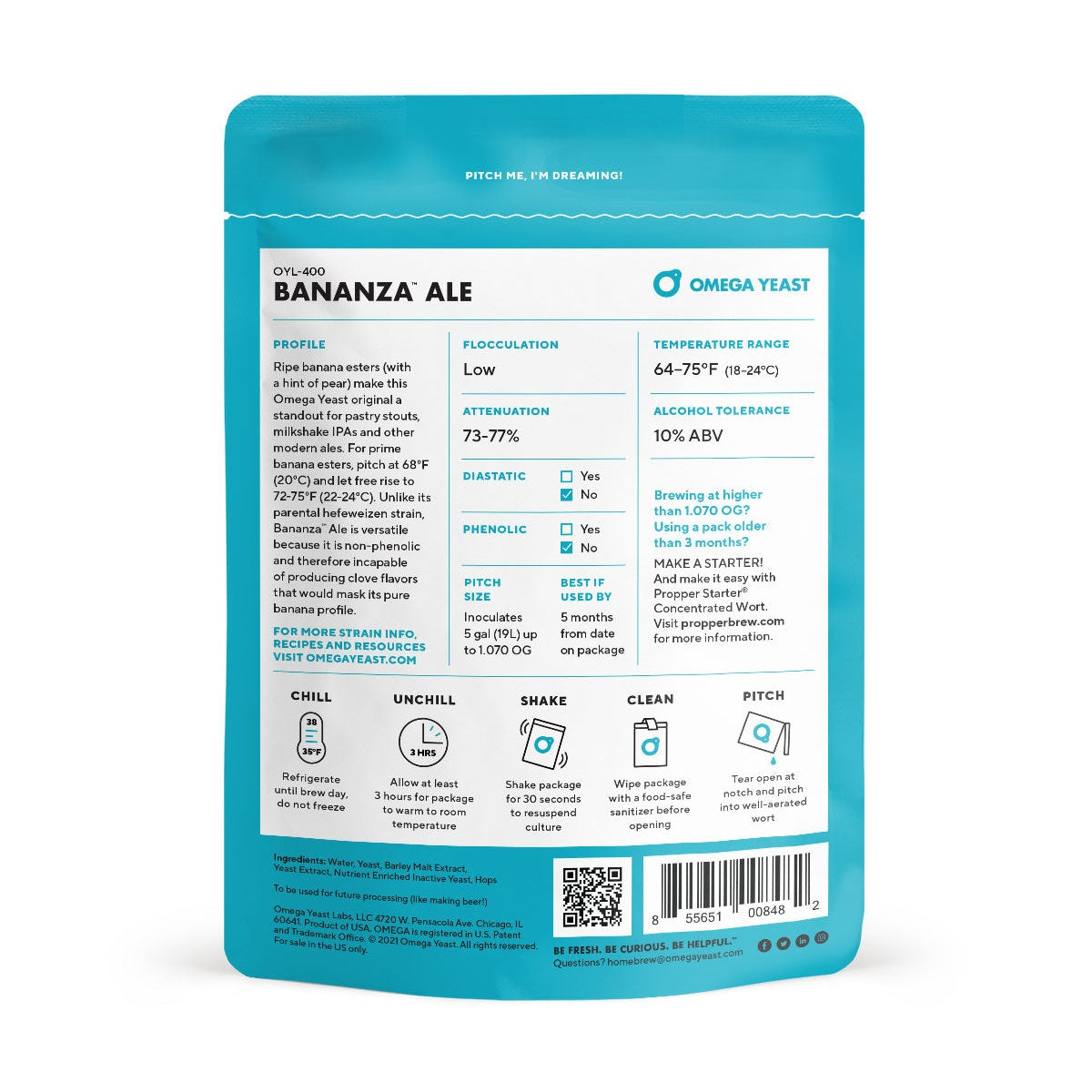 Ripe banana esters (with a hint of pear) make this new, Omega Yeast original a standout for pastry stouts, milkshake IPAs and other modern ales. For prime banana esters, pitch at 68°F (20°C) and let free rise to 72-75°F (22-24°C). Unlike its parental Hefeweizen strain, Bananza is versatile because it is non-phenolic and therefore incapable of producing clove flavors that would mask its pure banana profile.