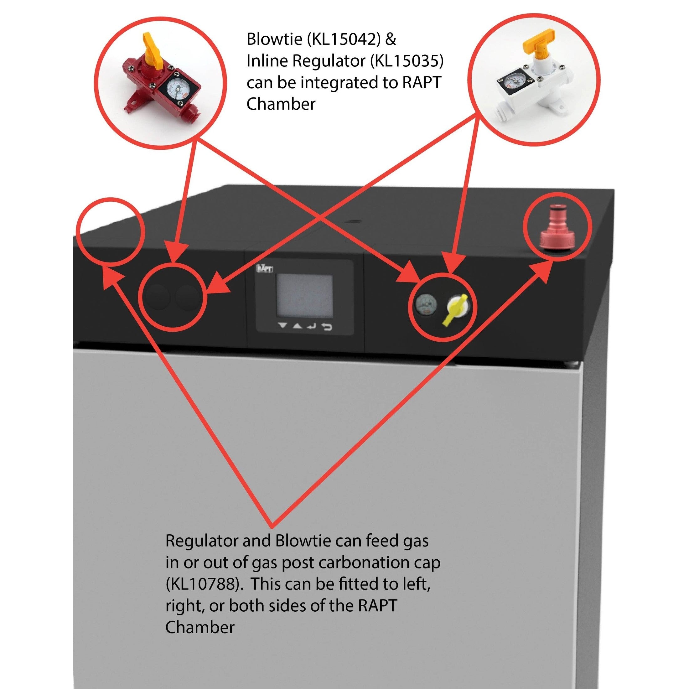 The RAPT's control panel comes complete with an integrated color TFT screen. The 4-button color display conveniently shows a log of historic temperature graphs, allows you to start/set/stop temperature profiles, and gives you access to other critical information for that particular fermentation. An integrated secondary regulator can be used to regulate gas into the fridge with the Duotight In-Line Regulator on one side, and on the other you can install an integrated BlowTie 2 Spunding Valve to regulate residual pressure in your fermenter.