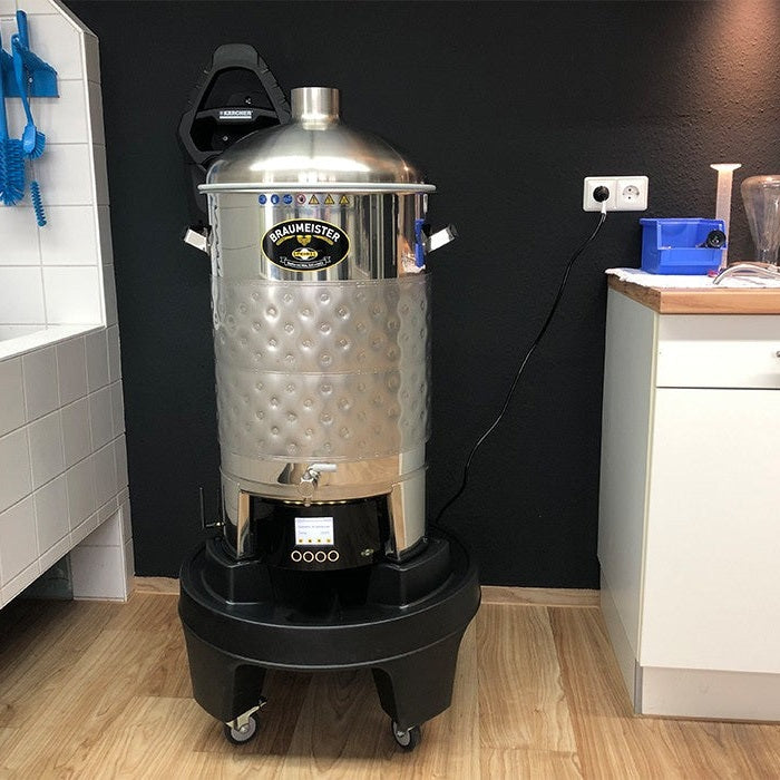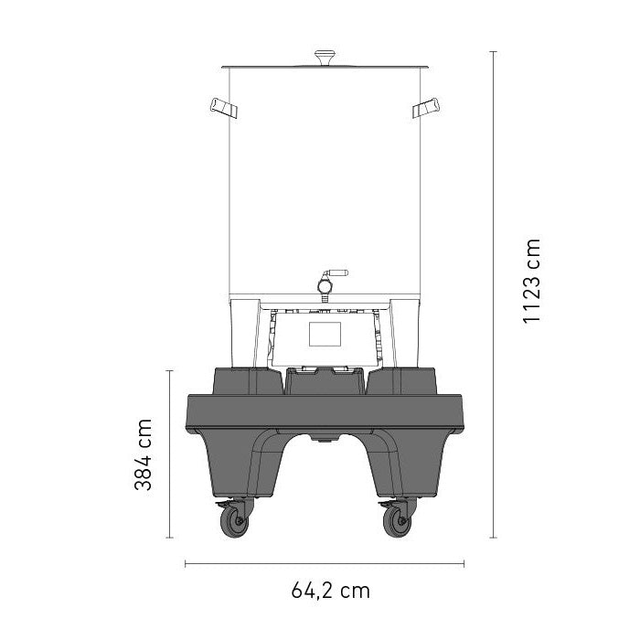 With the rolling base for the 50L Braumeister, you can easily move the unit around your brewing area and lock it in place with the castor brakes. Do your brewing in one area, then wheel it over to where it's more convenient to clean without ever needing to pick the system up. There's plenty of clearance between the rolling base and the Braumeister, which allows you to open the pump for cleaning and dry it after brewing. A reservoir molded into the base will collect drips and splashes, and then you can position it near a drain to unplug and drain the reservoir.