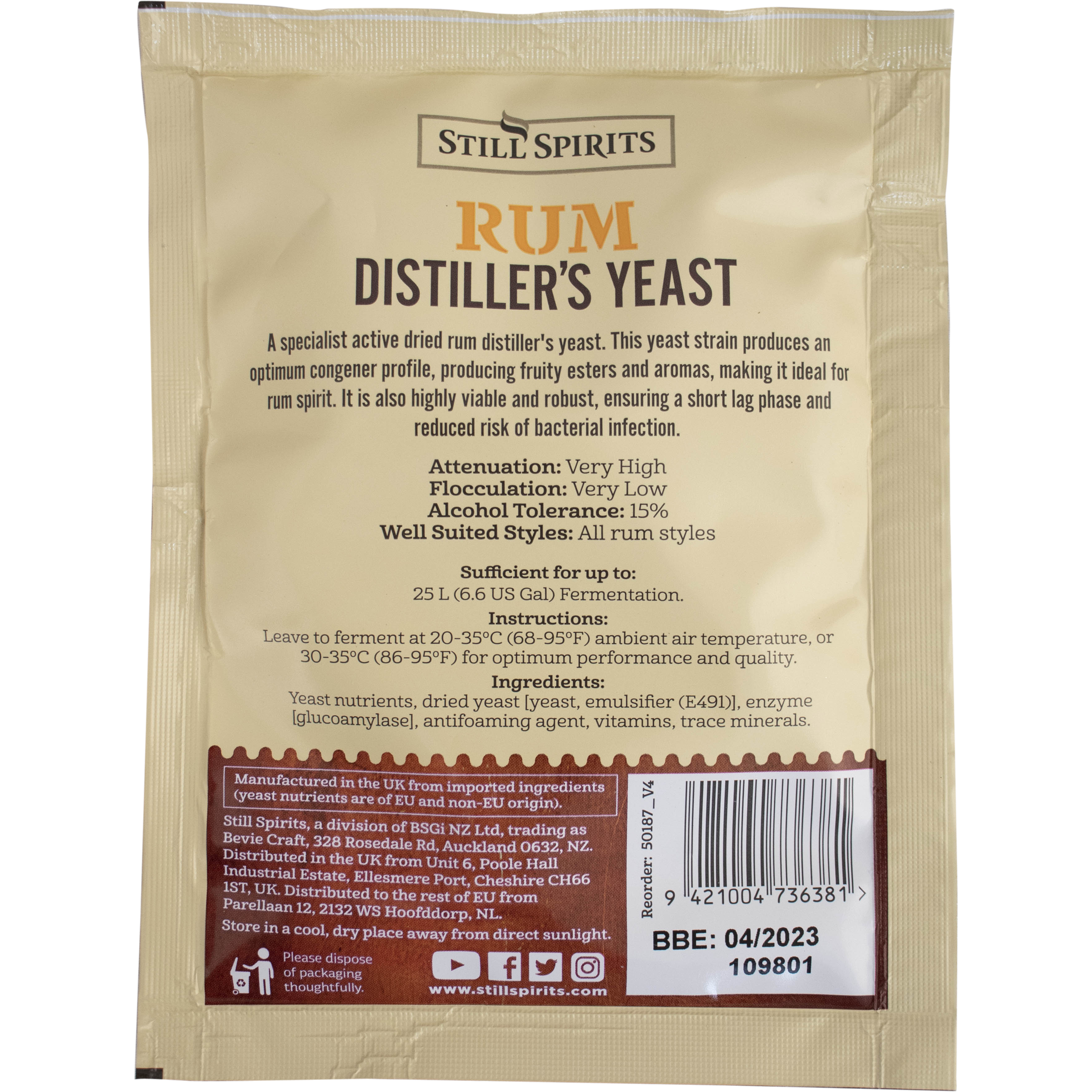 Our Rum Distillery Yeast is an Osmophilic Saccharomyces Cerevisiae strain especially suited to 50:50 blend of molasses and sucrose fermentations to 15%ABV. Contains complete nutrition for rapid fermentation. Producing full, rich fruity aromatics, it also includes amyloglucosidase enzyme for breaking longer-chain sugars for optimum yield. Sufficient for 6.6 gallon fermentation.