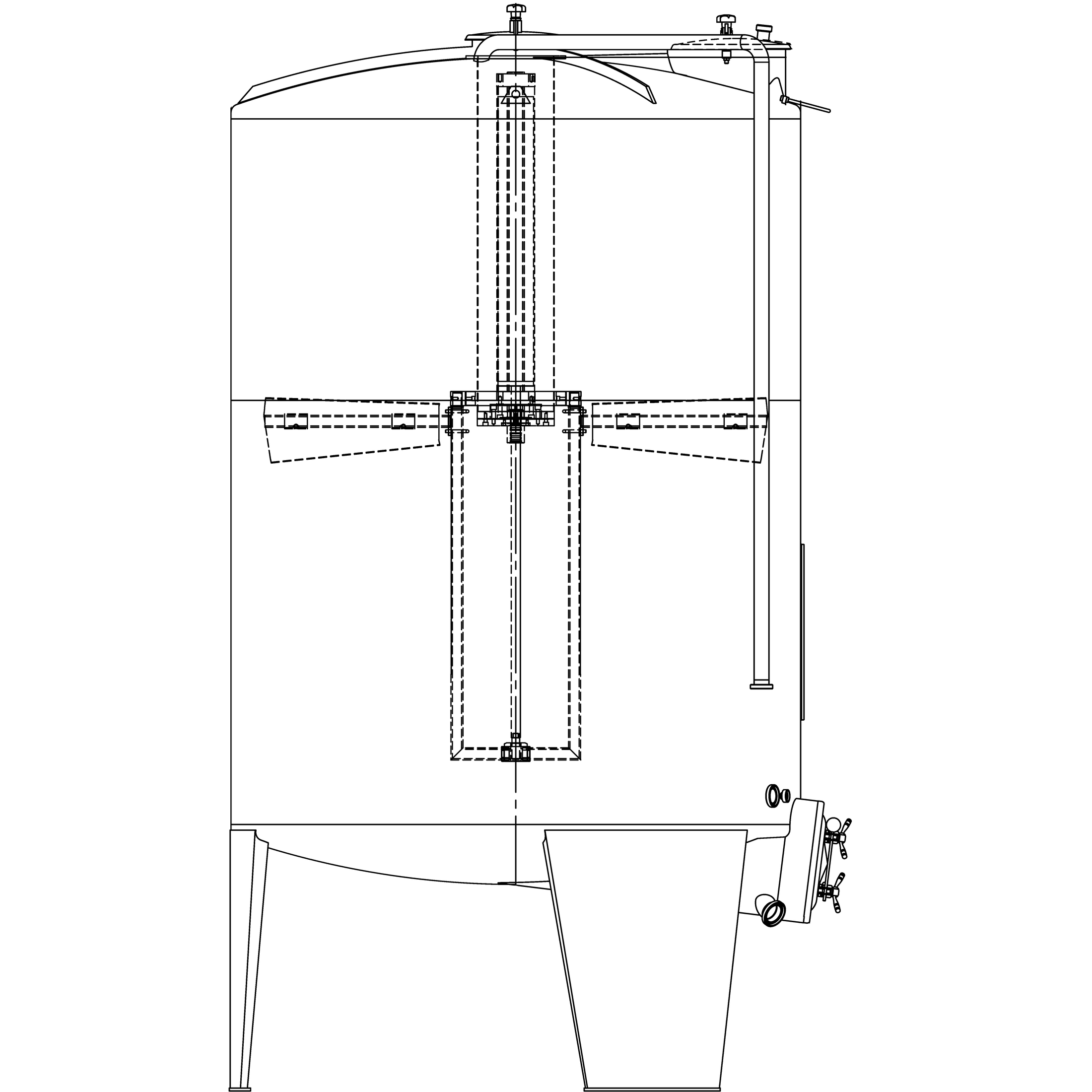 This simple but effective system features an external  pneumatic cylinder which drives the punching assembly. During the downward stroke the folding stainless punching wings lay flat against the top of the pommace cap and push the solids back into the fermenting wine. On the upward stroke of the cycle the wings set at angle which induces the wings to rotate about 30 degrees, position themselves over a fresh segment of the cap, and the cycle then repeats itself. The whole cap can be punched in as little as 5-6 punch cycles—about 15 minutes!