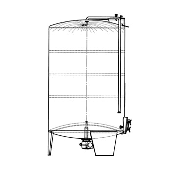 A simple and robust red fermentation tank based on the Pumpover style of cap management, with a twist. Instead of standard pumpover flooding, this tank is used in a partial-delestage technique where approxiamtely half the fermenting juice is transferred out of the tank once a cap has formed. As the juice is pumped out and the cap descends through the tank, offset horizontal stainless bars that are welded in place within the tank cause the cap to naturally break up. Then the removed juice is pumped back in through the external piping and through the spinning flooder head in the tank ceiling, wetting and re-submerging the cap!