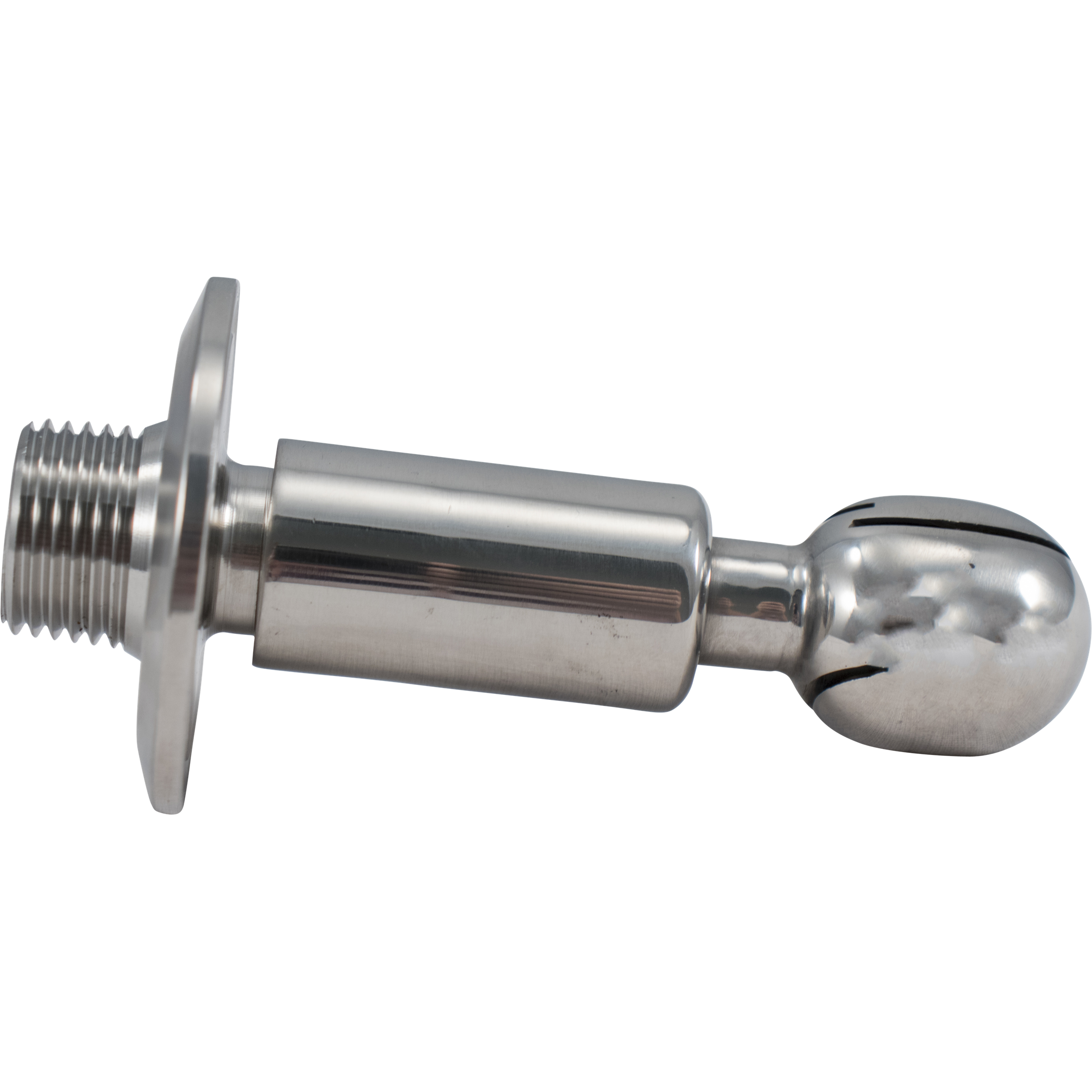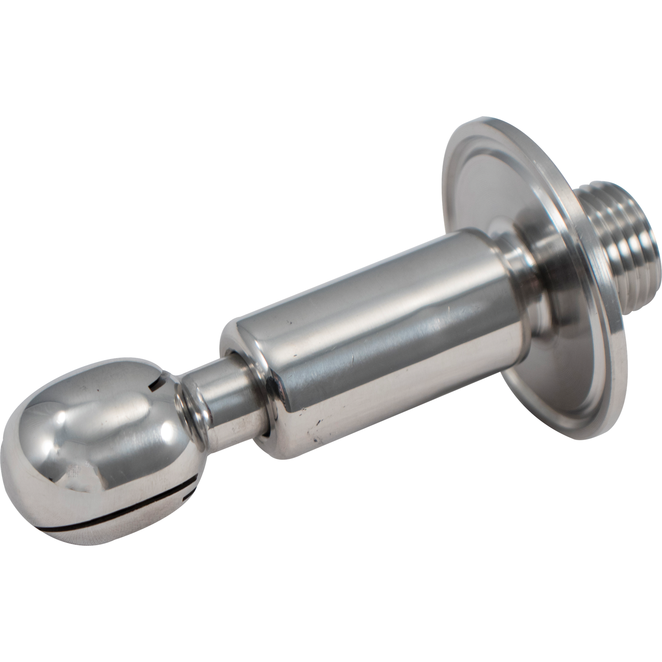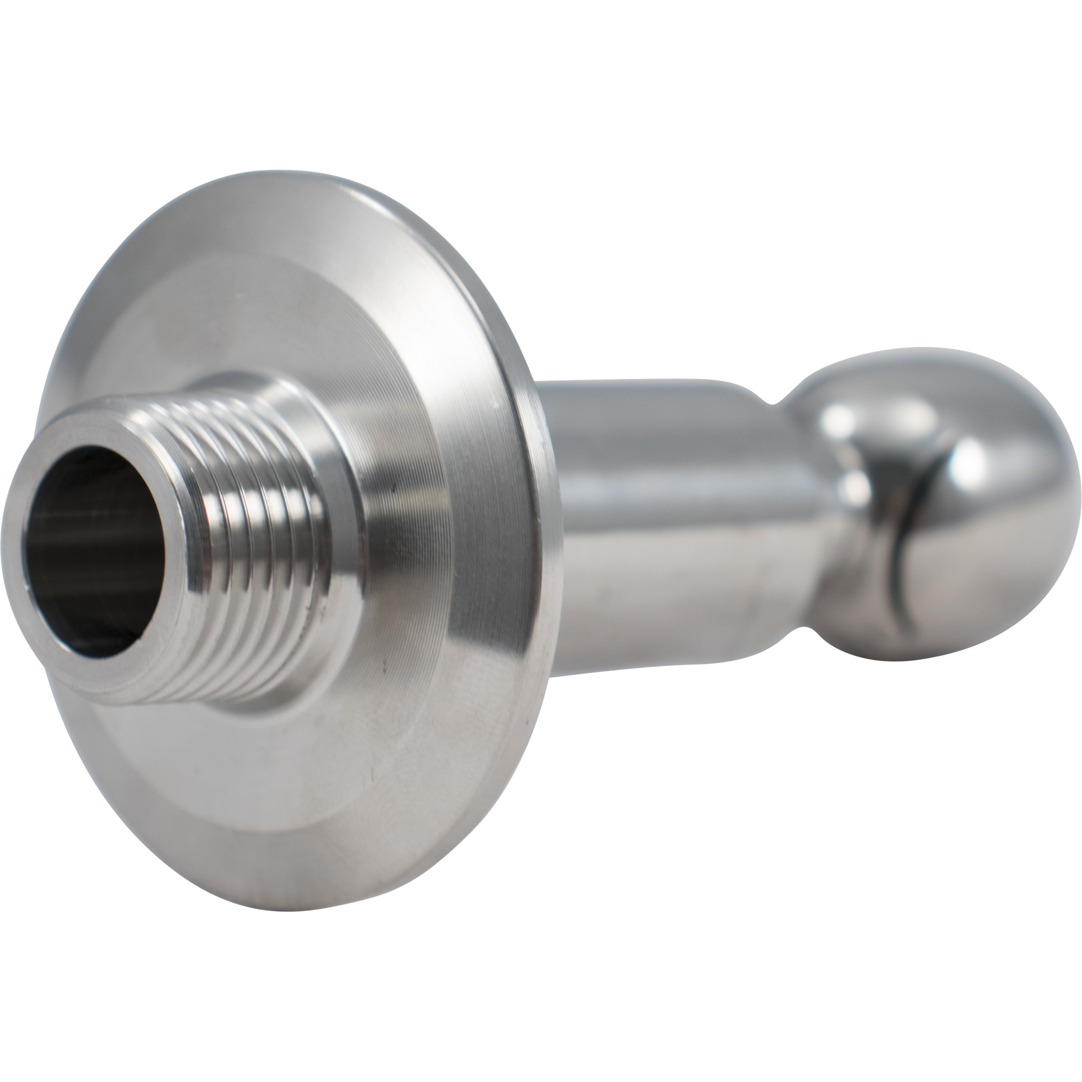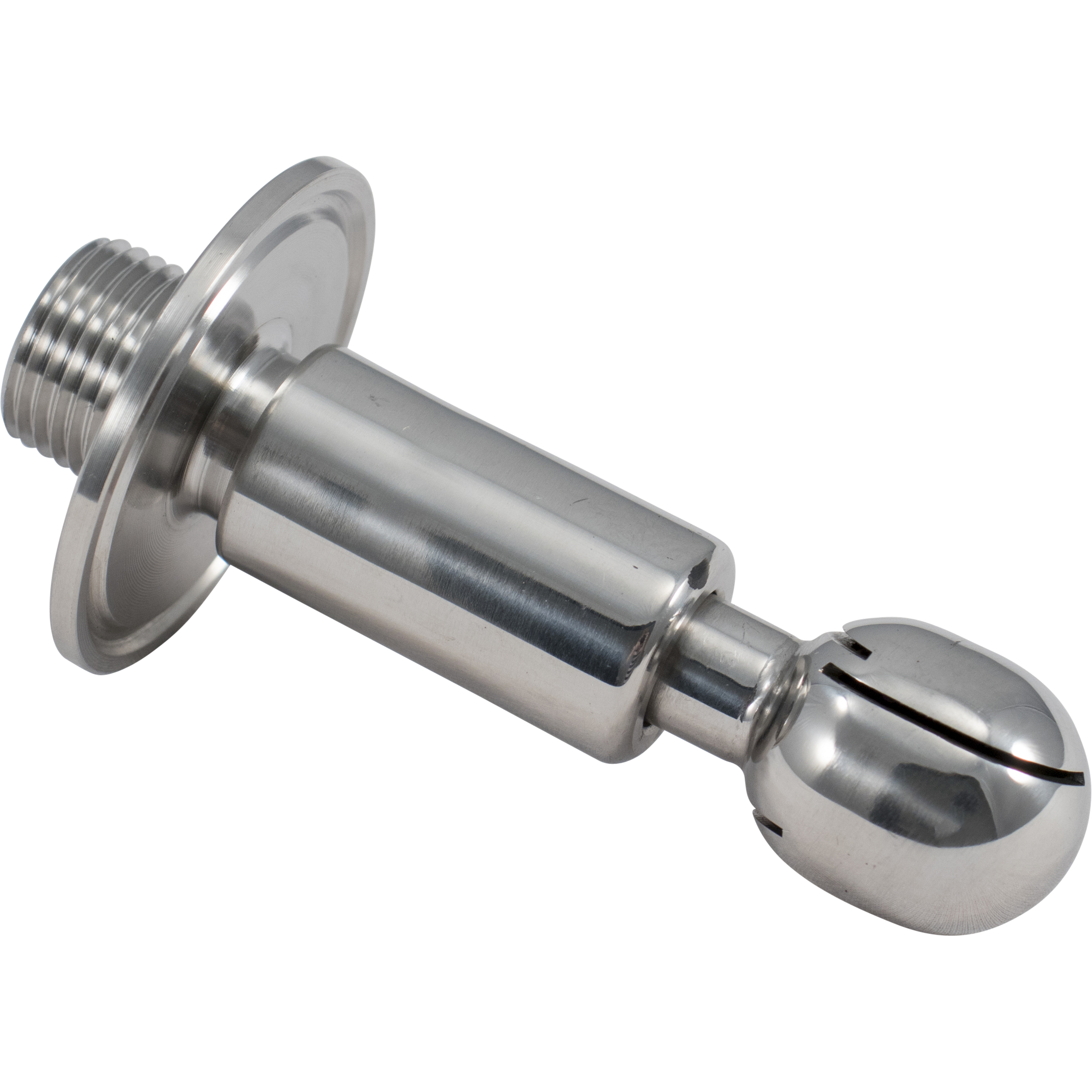 This clean in place spray ball from Ss Brewtech attaches to a 1.5" tri clamp to clean the inside of whatever container you attach it to. Has a 1/2" MPT and made from 304 stainless steel. The attachment is 2.5 in. long and 0.75 in. wide.