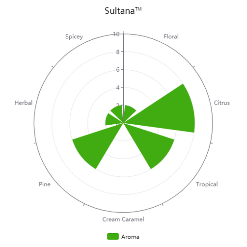 Sultana™, AKA Experimental Variety 06277/ Denali™, is a new hop bursting with flavor. Called Nuggetzilla by some, this hop is rich in pineapple, citrus, and pine flavors, though it can often come off as spicy as well. It can be used for bittering, flavor, or aroma, and is sure to make an impact! These have rich characteristics that make for an unmistakeable beer. Try it in your next pale ale or IPA, sit back, and enjoy the results.