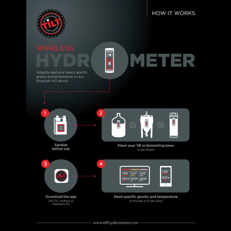 Designed for homebrewing, the Tilt hydrometer lets you instantly read your brew's specific gravity and temperature on your compatible Apple iPhone/iPad or Android smartphone/tablet or Tilt Pi. Most Bluetooth 4.0+ devices will work with the Tilt. You can then optionally log data to the cloud using their free Google Sheets template or other 3rd party cloud platforms.
